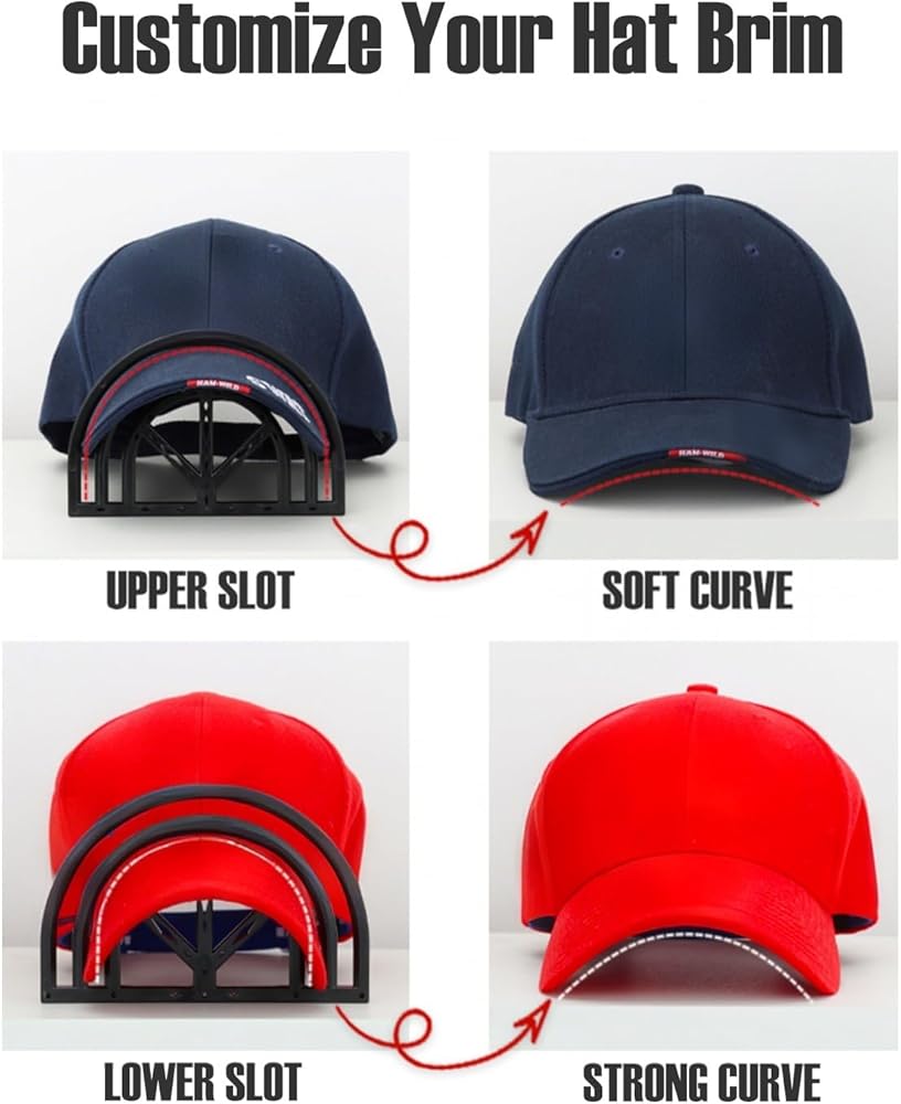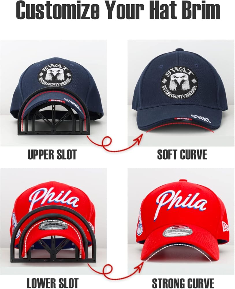 قم بتخصيص حافة القبعة الخاصة بك - تتيح لك أداة تقويس القبعة المبتكرة لدينا الاختيار من بين خيارين منحنيين - الفتحة العلوية لمنحنى ناعم أو الفتحة السفلية لمنحنى عميق - للحصول على قوس أنيق وموحد. لا حاجة إلى المزيد من الأربطة المطاطية المنحنية للقبعة.
