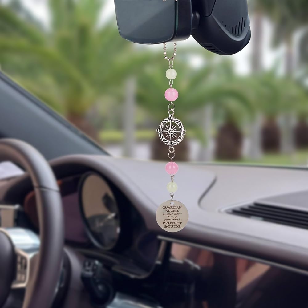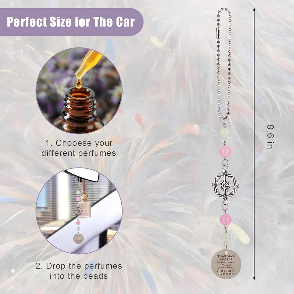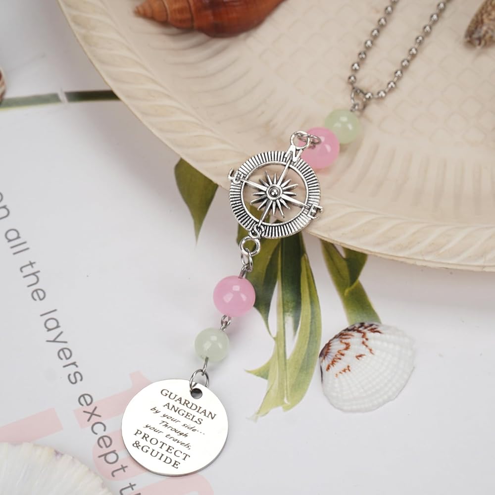 【MATERIAL】 Stainless antique silver angel charm and psalm charm,hanging on a 4 inch chain.Using exquisite natural stones, Pearls and crystals cross connect, Can be used as a rear view mirror car charm or ornament.