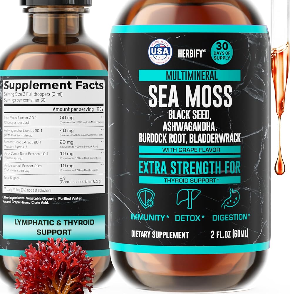 ملحق سائل البحر MOSS Multiminaler - البحر الأيرلندي الطحلب بذور البذور السوداء Ashwagandha Burdock Root Pladderwrack - صحة الأمعاء ، ودعم المناعة والغدة الدرقية للنساء - نكهة العنب - 2 أوقية - مصنوعة في الولايات المتحدة الأمريكية