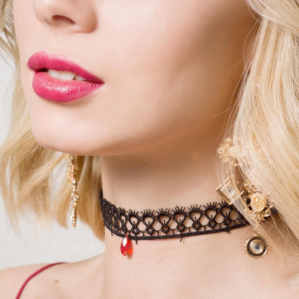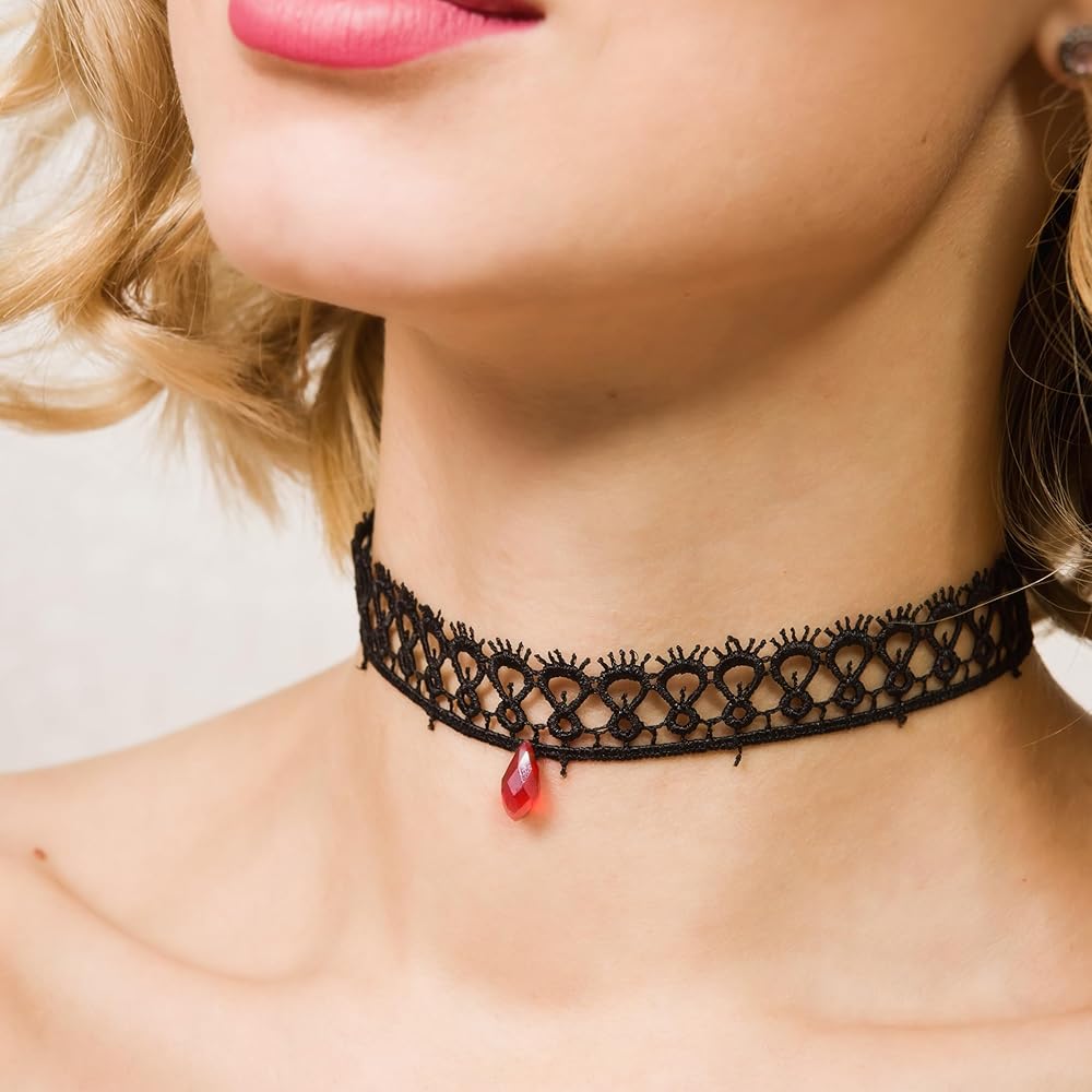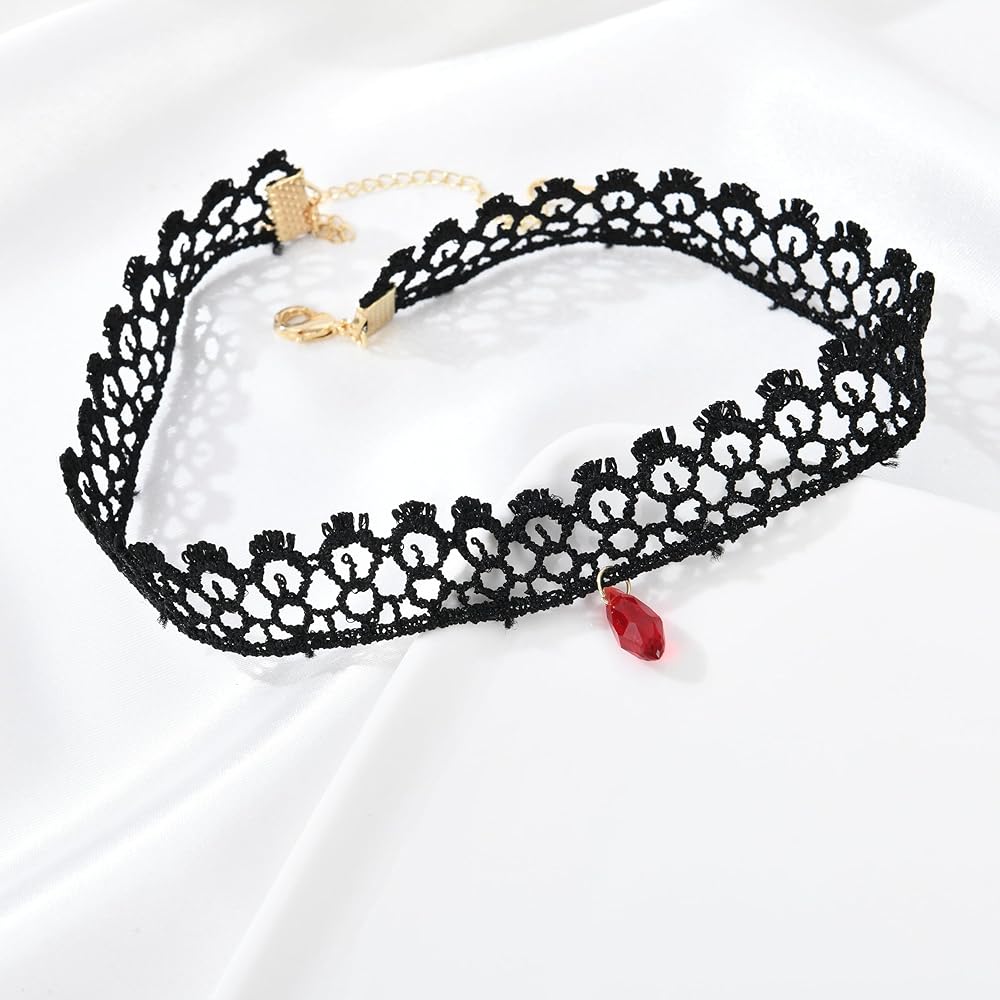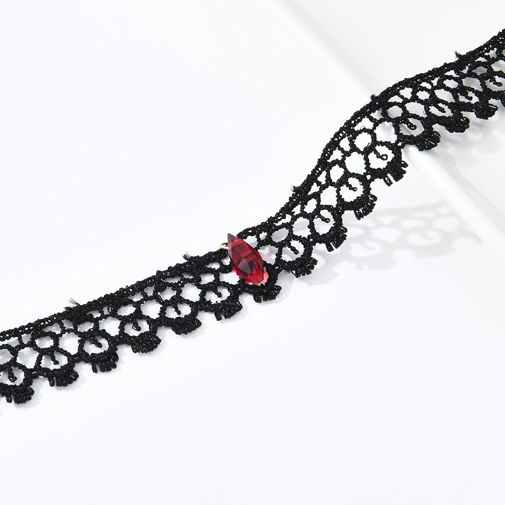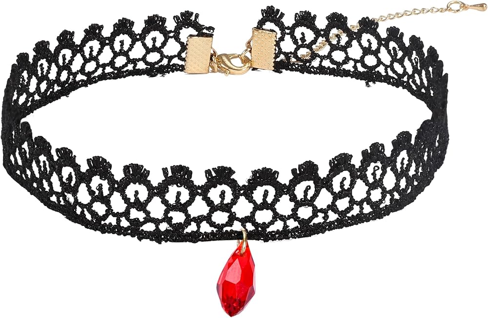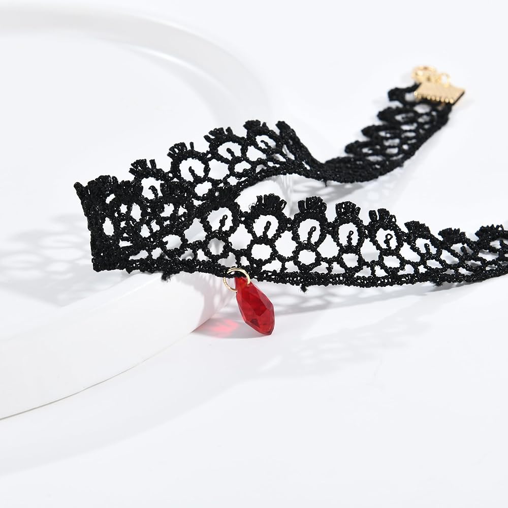 قلادة شوكر سوداء قوطية للنساء، قلادة لوليتا من حجر الراين الاحمر، قلادة سوداء من الدانتيل، مجوهرات حفلات الهالوين التنكرية، طول قابل للتعديل من 10-14 انش، بدون احجار كريمة