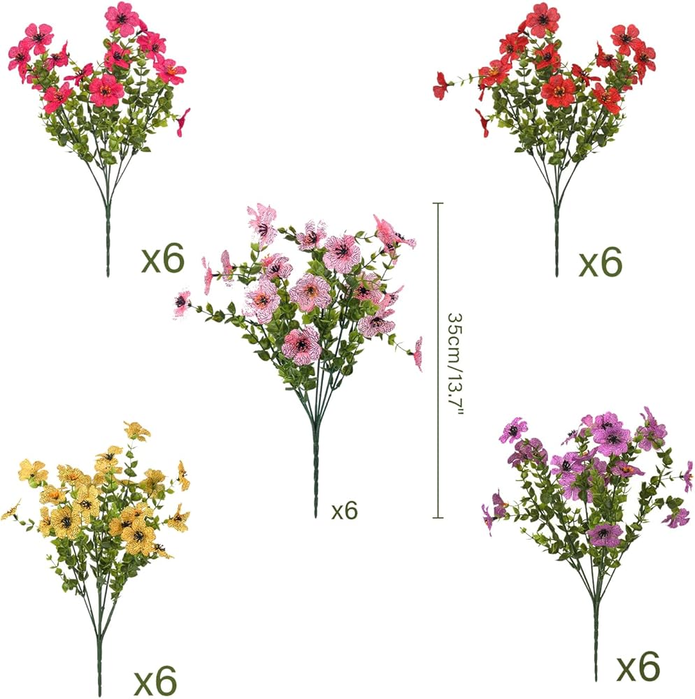 Size and Quantity: 50 Bundles of fake flowers plants in total, include 10 pcs yellow,10 pcs purple ,10 pcs red, 10 pcs rose red and 10pcs pink. With 12.2" Length,each shrub has 5 flexible stems and dense leaves.