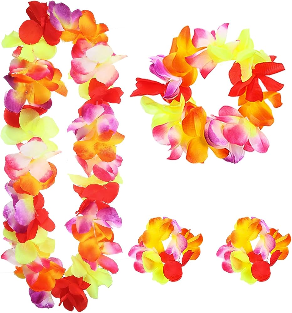 مجموعة ملونة: زهرة leis نابضة بالحياة بما في ذلك الأصفر والأخضر والبرتقالي والأزرق والأرجواني والأحمر. تنانير الحشمة: ألوان مختلطة مشرقة. بتلات كبيرة وكثيفة لأساور الزهور وعقال رأس وقلادة ، يجعلك ساحرة وجذابة