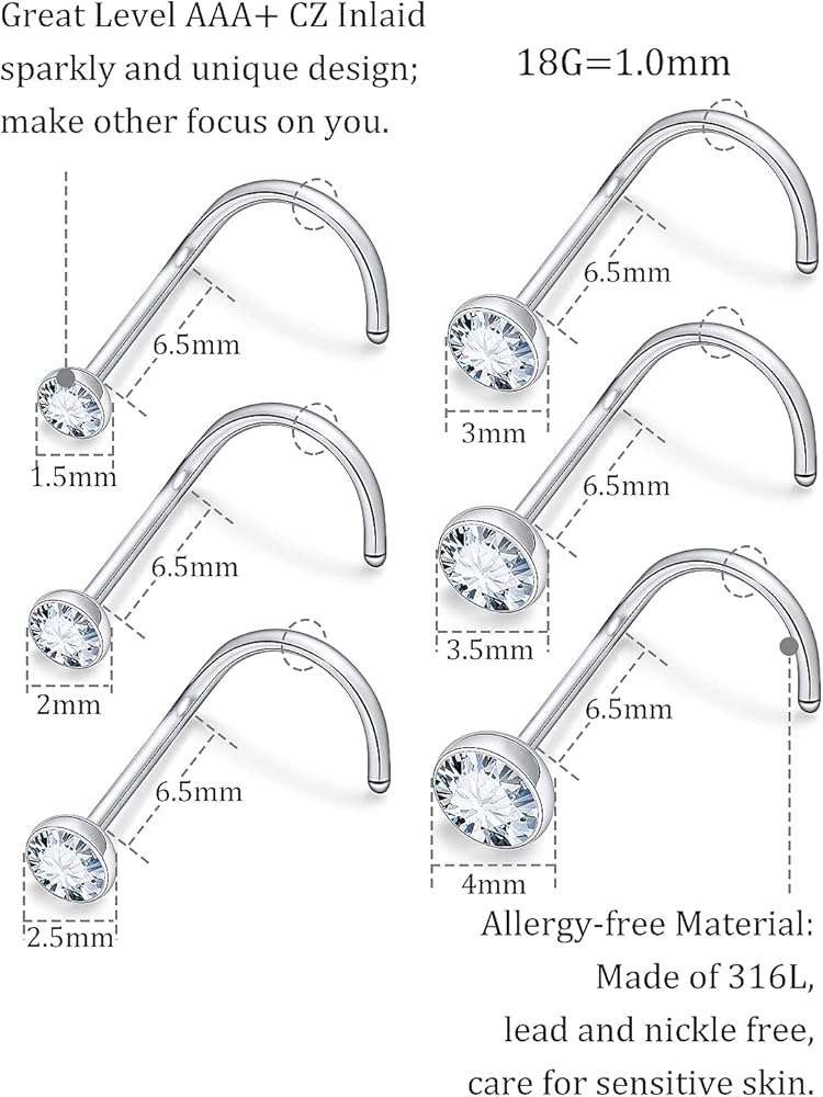 مقاييس ترصيع الأنف: 18G = 1.0 مم ، طول دبوس حوالي 7 مم ، حجم CZ: 1.5 مم ، 2 مم ، 2.5 مم ، 3 مم ، 3.5 مم ، 4 مم ؛ تلبي أحجام مختلفة الاحتياجات المختلفة للأزياء.