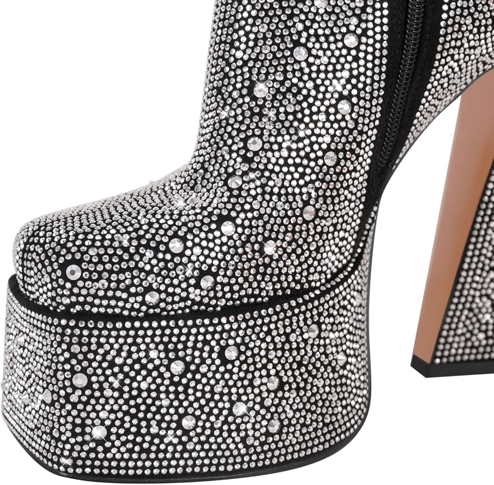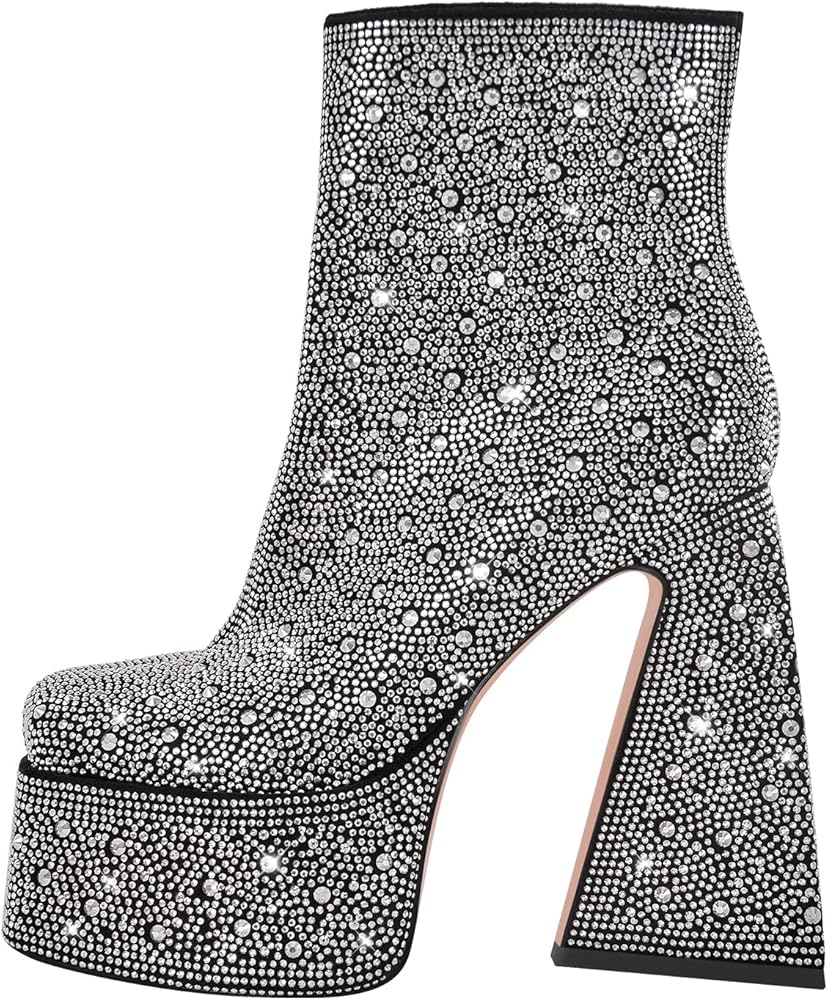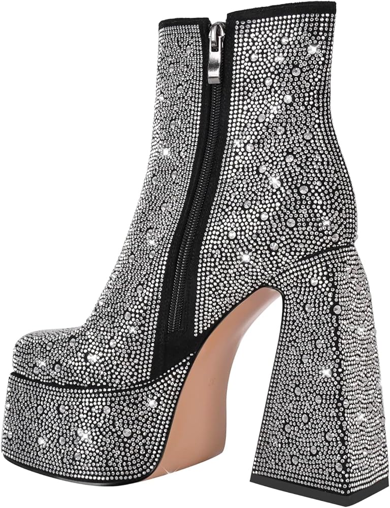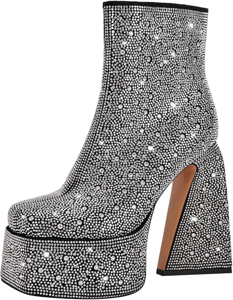 - تصميم خاص: المنصة: 2 بوصة/5 سم، لون ثابت، مقدمة مربعة؛ تصميم بسحاب يسمح بسهولة الارتداء والخلع. حجر الراين، جلد