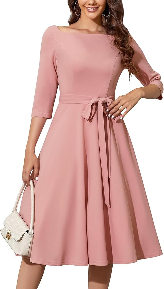 فستان كوكتيل عتيق: رقبة على شكل قارب، وأكمام 3/4، وطول الشاي، ومطويات جميلة، وظهر على شكل حرف V، وحزام قابل للإزالة. يجمع فستان أودري هيبورن المتأرجح ذو التصميم الخلفي على شكل حرف V بين العناصر المثيرة والعصرية. تعرض البشرة المناسبة، فقط للتعبير عن القليل من الجاذبية. حزام فيونكة رقيق يُظهر خصرك المثير ويطيل قوامك وساقيك.