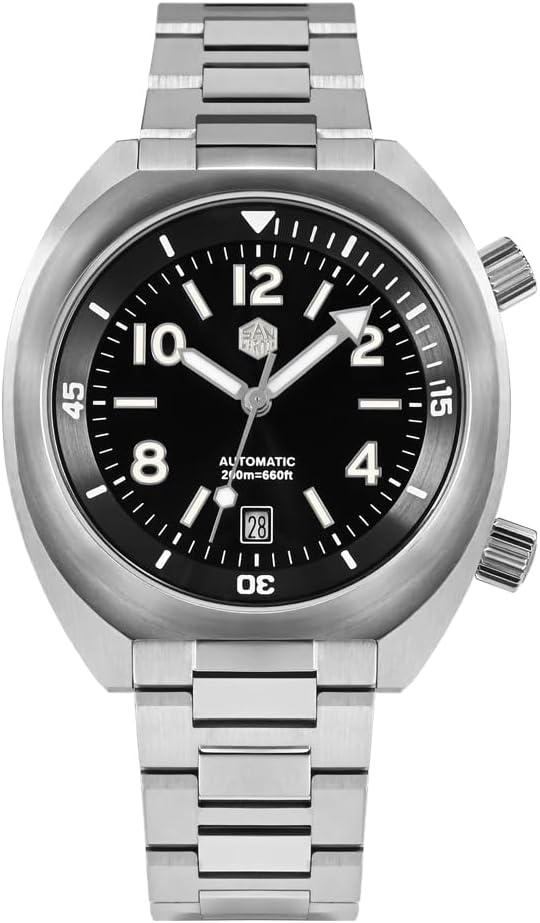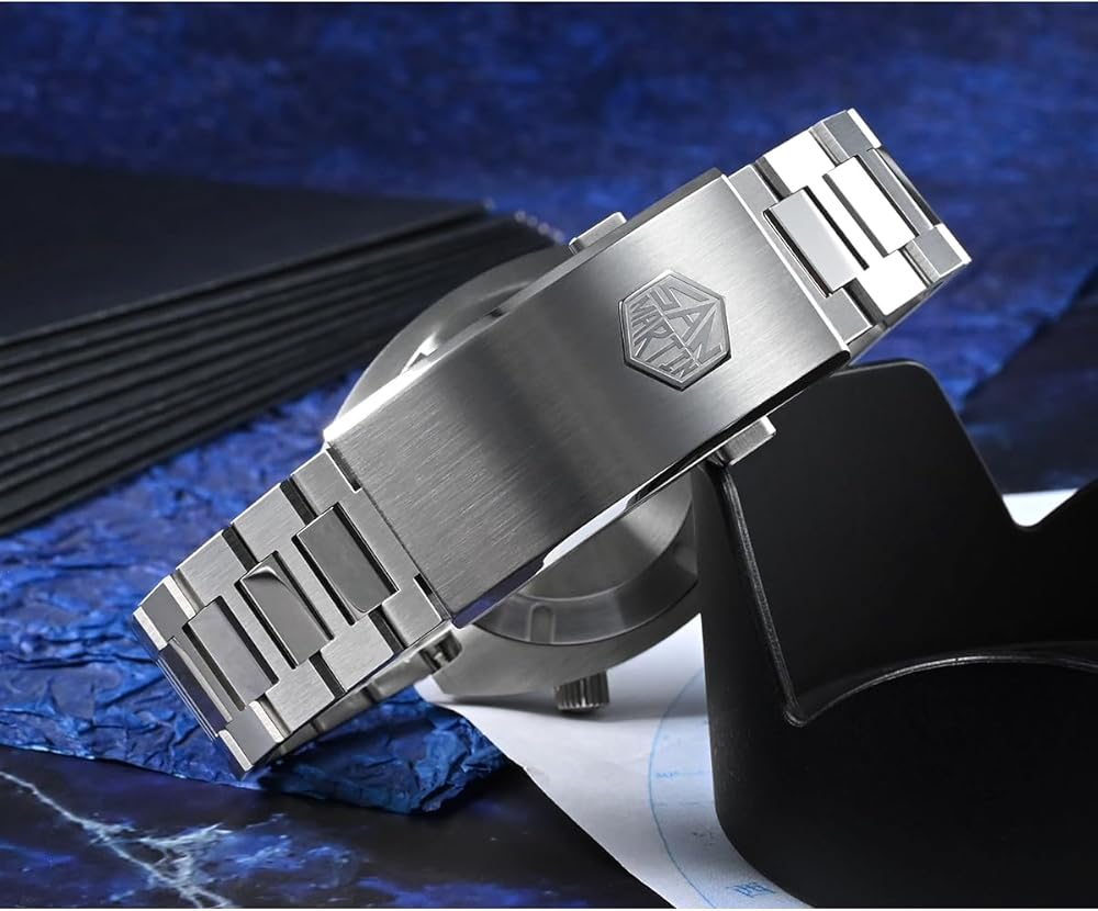 Brand: San Martin Model: SN0066-G Movement: YN55A [Automatic mechanical movement] Case: Material - 316L Solid Stainless Steel Case 42mm in diameter Lug to Lug 46.5mm Thickness 12.4mm Band width 20mm Glass: Sapphire Crystal Glass, AR Coating Bezel/Chapter Ring: Internal Bidirectional Turn Dive Bezel/Chapter Ring, Button Control Dial Color: Enamel Black, Applied indices, 6 O 'clock Position Date Windows Hands: Arrow Hands, Luminous Luminous: BGW-9 Blue Light, Hands and Markers Crown: Screw-down Crown, With 3D Hexagonal Logo Case Back: Screw-down Case Back Strap: 316L Solid Stainless Steel Bracelet, Size 20mm *18mm Clasp: New Fly Adjustable Clasp, With 3D Hexagon Logo Water Resistant: 20Bar=200 meters Weight: about 172g Warranty: 2 Year
