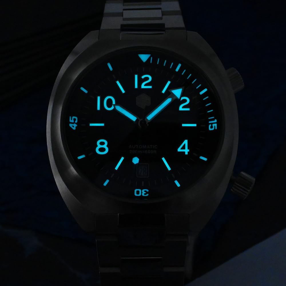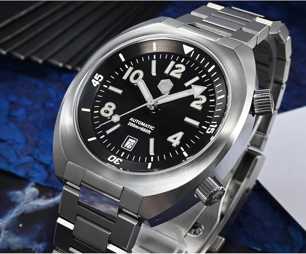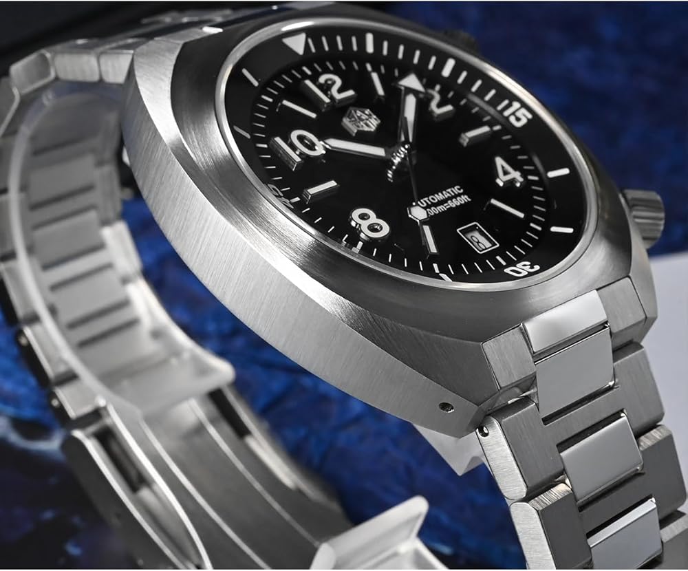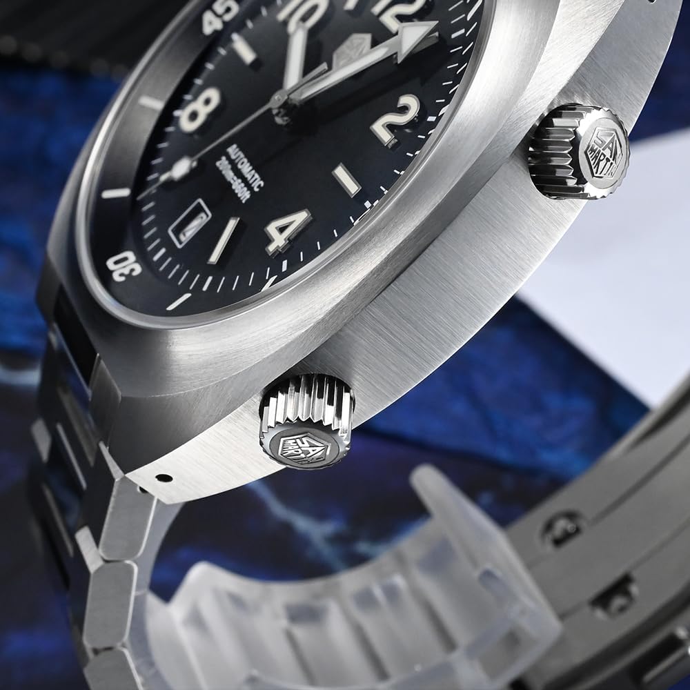 Glass: Sapphire Crystal Glass, AR Coating Bezel/Chapter Ring: Internal Bidirectional Turn Dive Bezel/Chapter Ring, Button Control Dial Color: Enamel Black, Applied indices, 6 O 'clock Position Date Windows Hands: Arrow Hands, Luminous