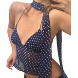 Upgrade your wardrobe with this women's polka dot halter top, an elegant and playful piece designed for summer fashion. Featuring a backless spaghetti strap design, this sleeveless crop tank highlights your silhouette while ensuring a breathable and lightweight feel. The included scarf accessory offers versatile styling—wear it as a chic necktie, wrap it around your waist, or use it as a hairband for an extra touch of glamour.