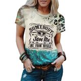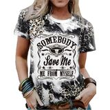 Women Somebody Save Me Steer Skull Letter Print T-Shirt Vintage Bleached Country Music Tshirt Retro Leopard Graphic Casual Shirt Tops