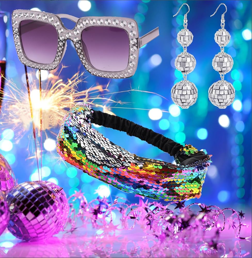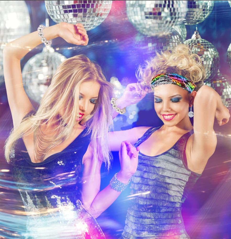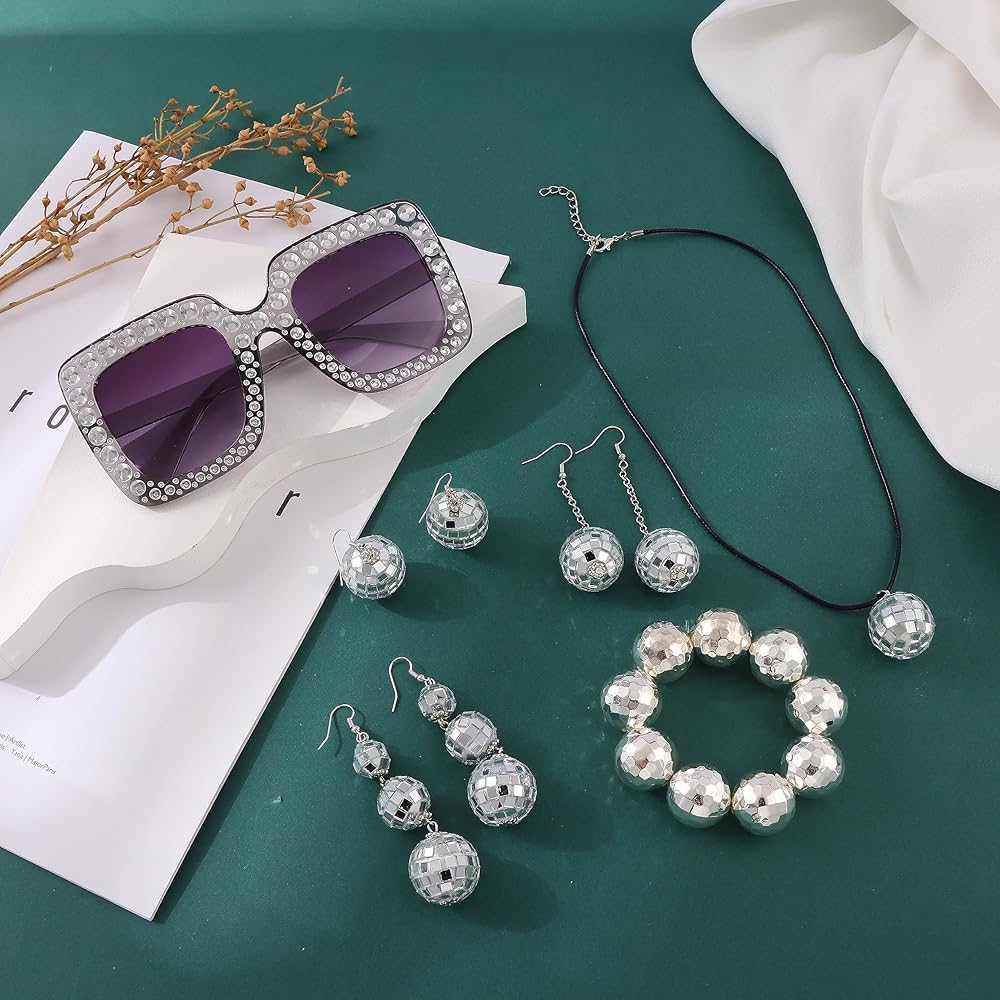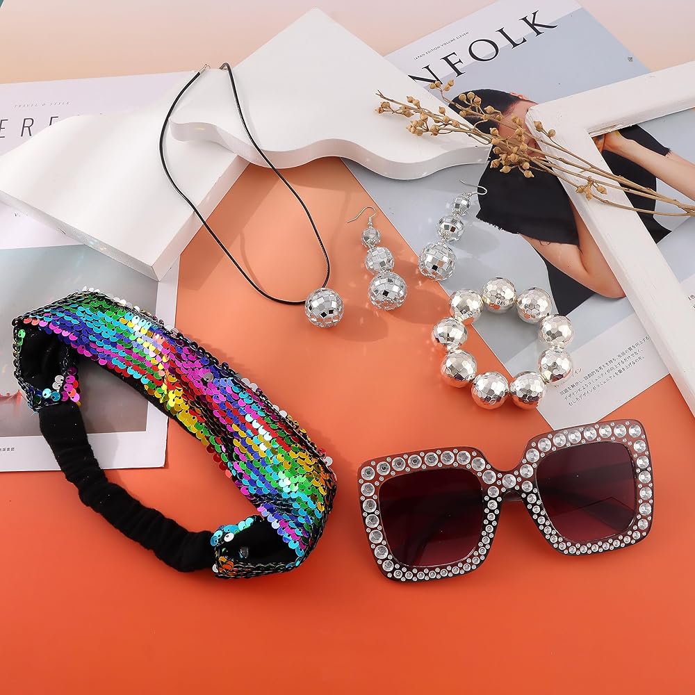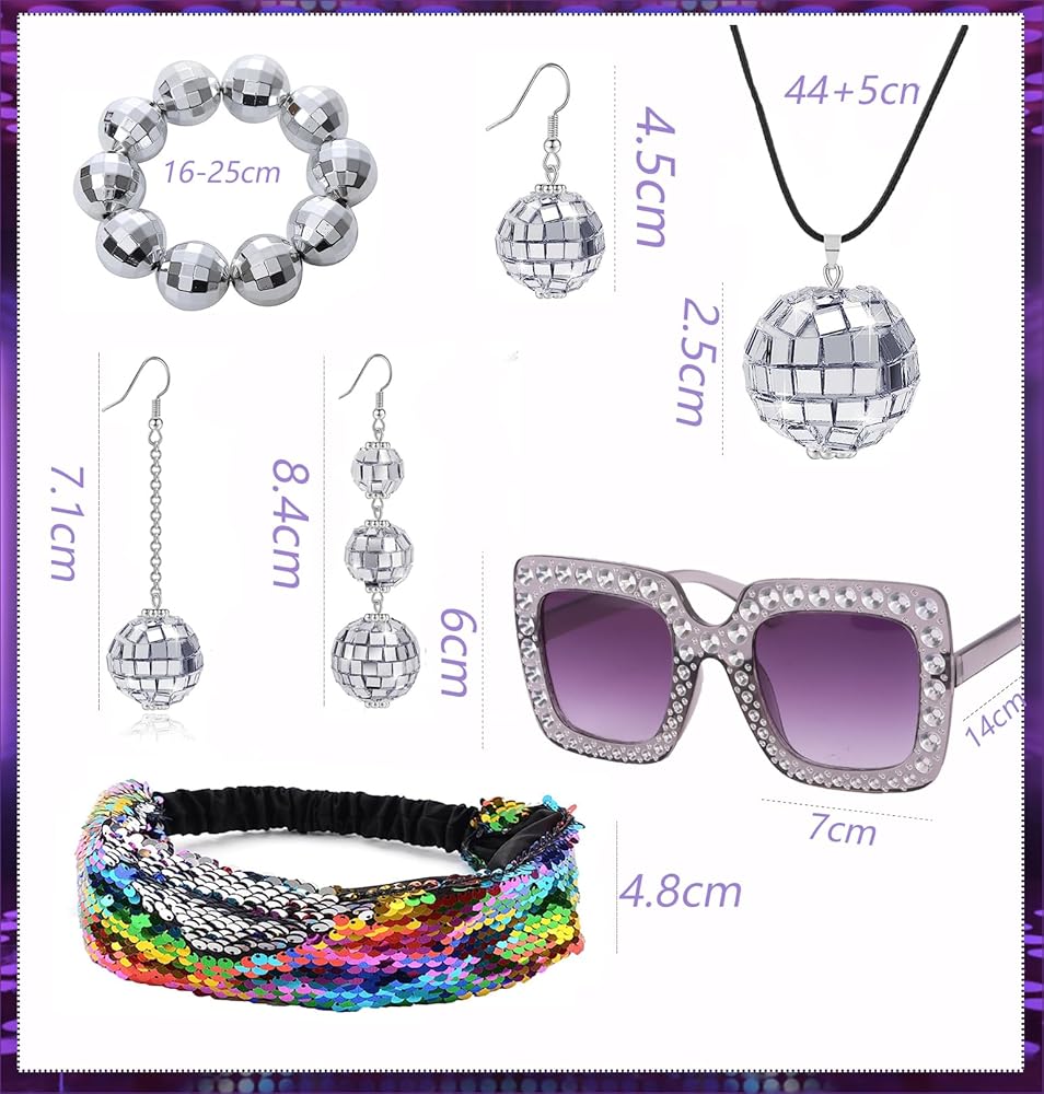 مجوهرات ديسكو من الستينيات والسبعينيات: تتضمن العبوة قطعة واحدة من عصابة الرأس الملونة، وقطعة واحدة من قلادة كرة الديسكو اللامعة ذات المرآة اللامعة، و3 أزواج من الأقراط المتدلية على شكل كرة الديسكو، وقطعة واحدة من سوار كرة الديسكو، و1 نظارة شمسية بإطار مربع أسود عتيق، جميعها كاملة ذات الطراز القديم، فإن ارتداء مجموعة الديسكو هذه للسيدات يمكن أن يجعلك أكثر جاذبية بما يكفي لترتديها في مختلف الحفلات.
