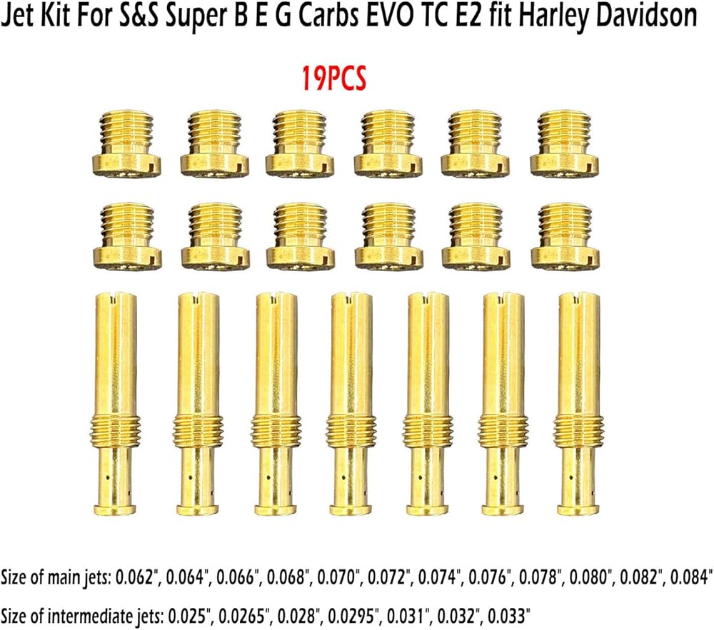 Main & Intermediate Carburetor Jet Kit For S&S Super B E G Carbs EVO TC E2 fit Harley Davidson Big Twin 1984 up This Aftermarket carburetor main jet replacement assortment is for S&S "B", "G" and "E" carburetors. Includes 7 intermediate jets and 12 main jets. One order of 19 JETS, the default size is as follows, you can also specify the quantity and size as needed Assortment includes one each intermediate jets .025", .0265", .028", .0295", .031", .032", .033" and one each main jets .062", .064", .066", .068", .070", .072", .074", .076", .078", .080", .082", .084". *NOTE: Also fit OHO shorty carburetors by V-Twin MFG.