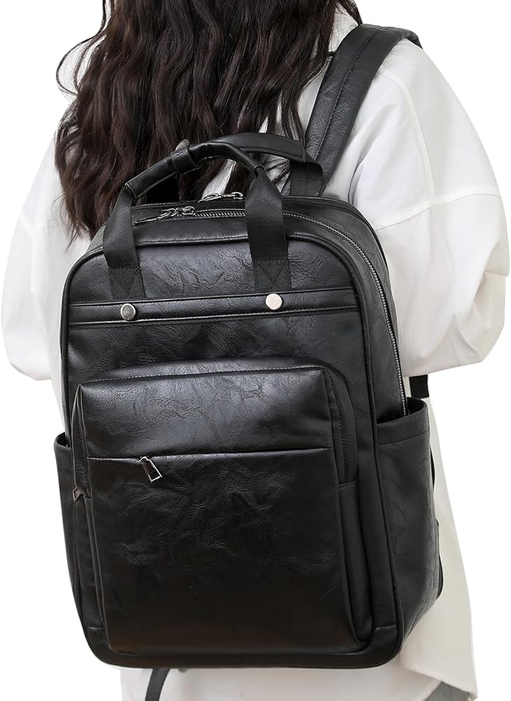 PU Leather Laptop Backpack for Women | 17 Inch Laptop Backpack for Work College School - Large Capacity Computer Bag Teacher Nurse Bag Casual Daypack (Black)