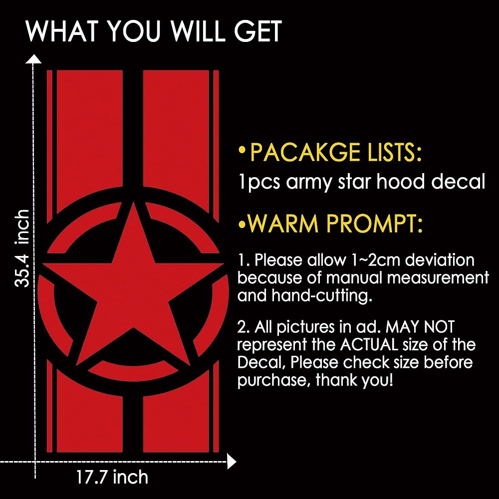 【ما ستحصل عليه】 1pcs 35.4x17.7 بوصة ملصقات نجم الجيش الأمريكي ، مثالي للشاحنة ، بيك آب ، سيدان ، RV ، سيارات الدفع الرباعي ، الشاحنة ، العربة ، القارب ، وتزيين المنزل. (ملاحظة: قد لا تمثل جميع الصور في الإعلان الحجم الفعلي للصيغة ، يرجى التحقق من الحجم قبل الطلب ، شكرًا لك!)