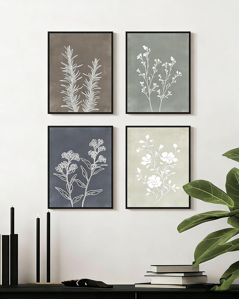 فن الجدار النباتي - فن الجدار النباتي ذو لون خلفية مختلف يمثل تأثيرًا عتيقًا ، كل زهرة هي نوع مختلف من النباتات وطباعة باللون الأبيض ، واللون المحايد أنيق وجميل. سيكون الزخرفة الفنية المثالية لغرفتك.