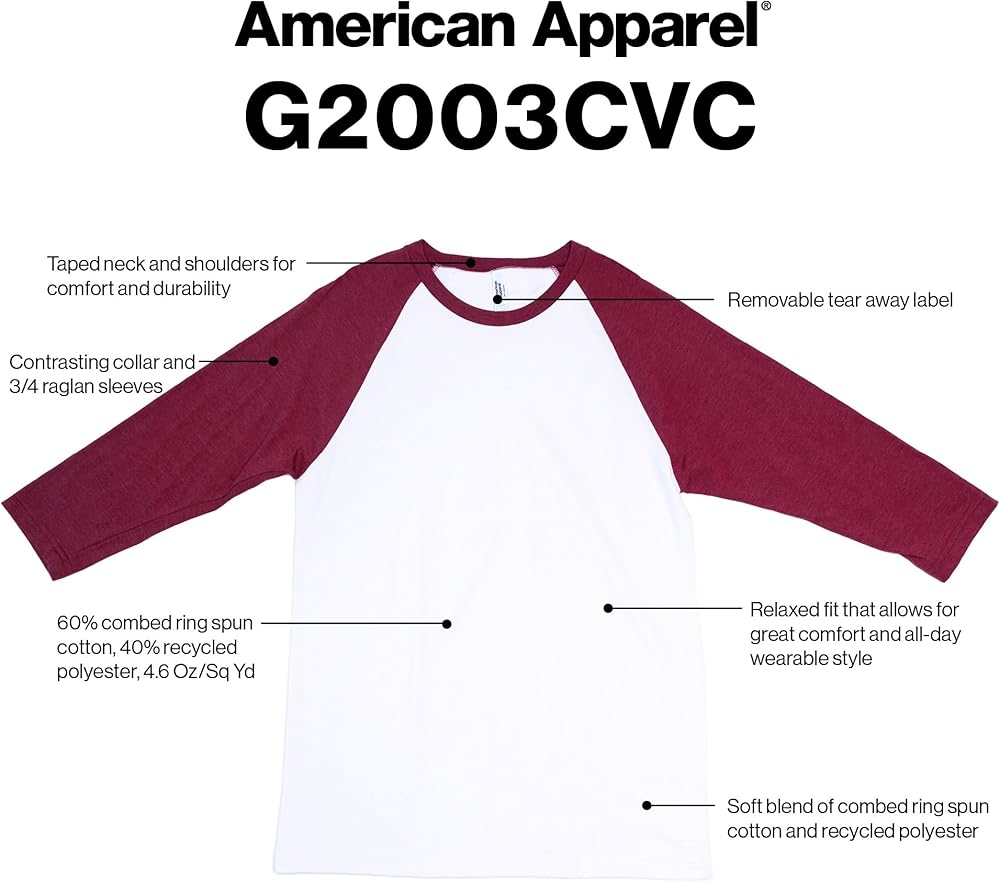 تي شيرت CVC Raglan للجنسين من American Apparel، طراز G2003CVC، عبوة من قطعتين