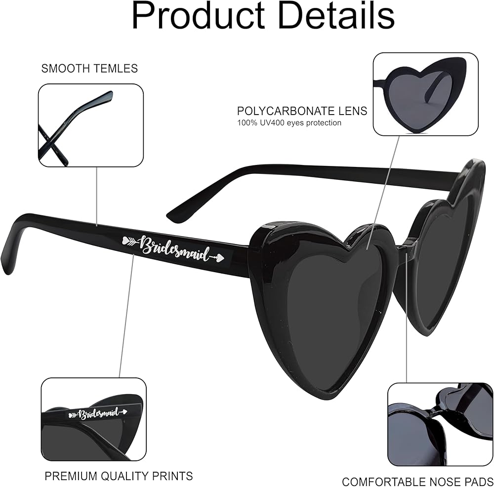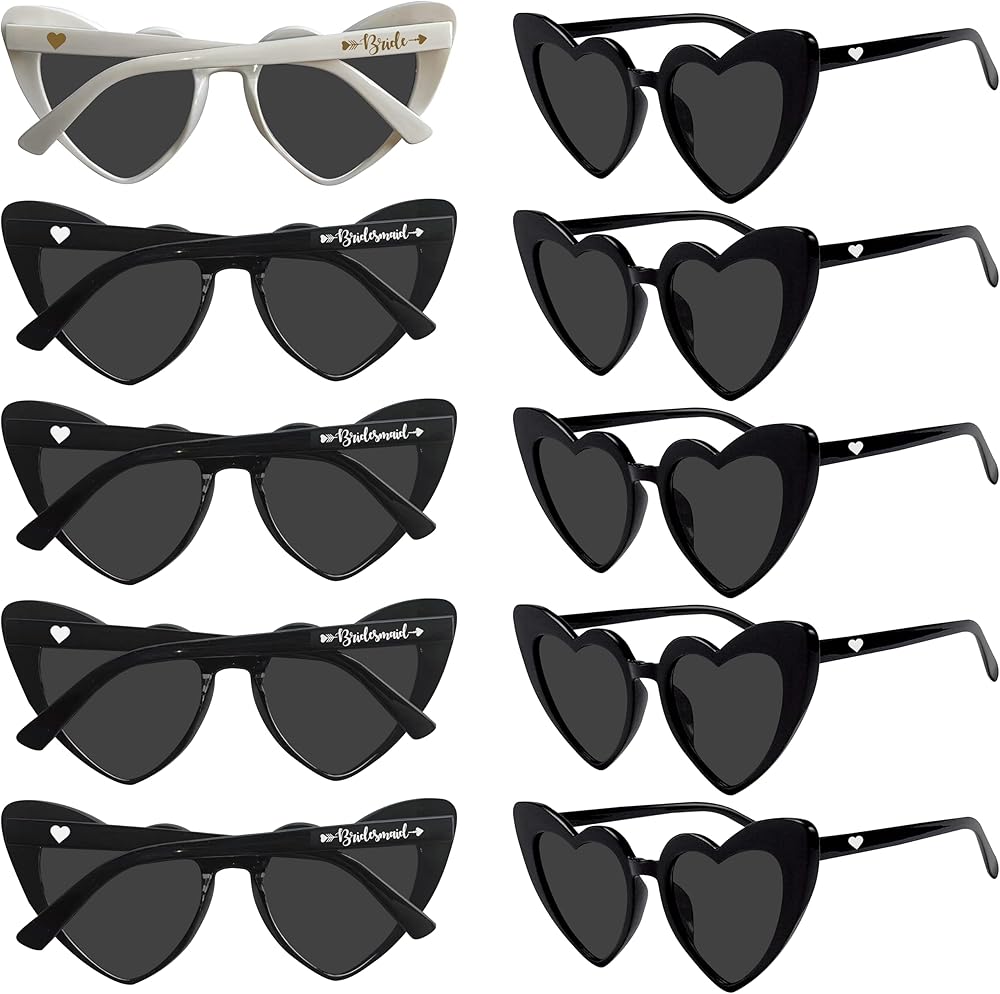 ما يشمل: مجموعة النظارات الشمسية لدينا تأتي في ما مجموعه 10 أزواج نظارة شمسية على شكل قلب ، بما في ذلك زوج واحد من النظارات الشمسية "العروس" البيضاء و 9 أزواج من النظارات الشمسية "وصيفات الشرف" مع صندوق رائع. يمكن أن ترضي كمية كافية لباسك اليومي ويمكنك مشاركتها مع فرقة العروس أو عائلتك. تفضل الحفلة المثالية لحفلة البكالوريوس ، حفل زفاف ، دش الزفاف.
