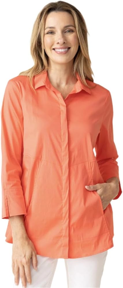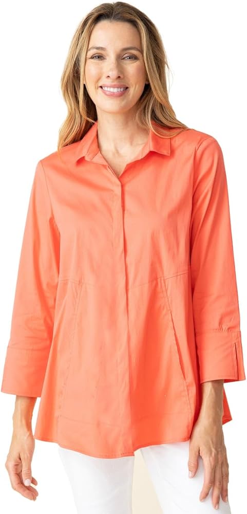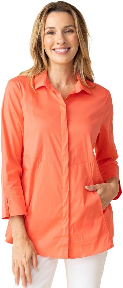 • The classic blouse is reimagined into a show stopper. The hidden placket leads to two on seam pockets and a flattering a-line silhouette. Stretch cotton button front with elegant ¾ sleeves with split cuffs. Rounded hem falls below the hip.
