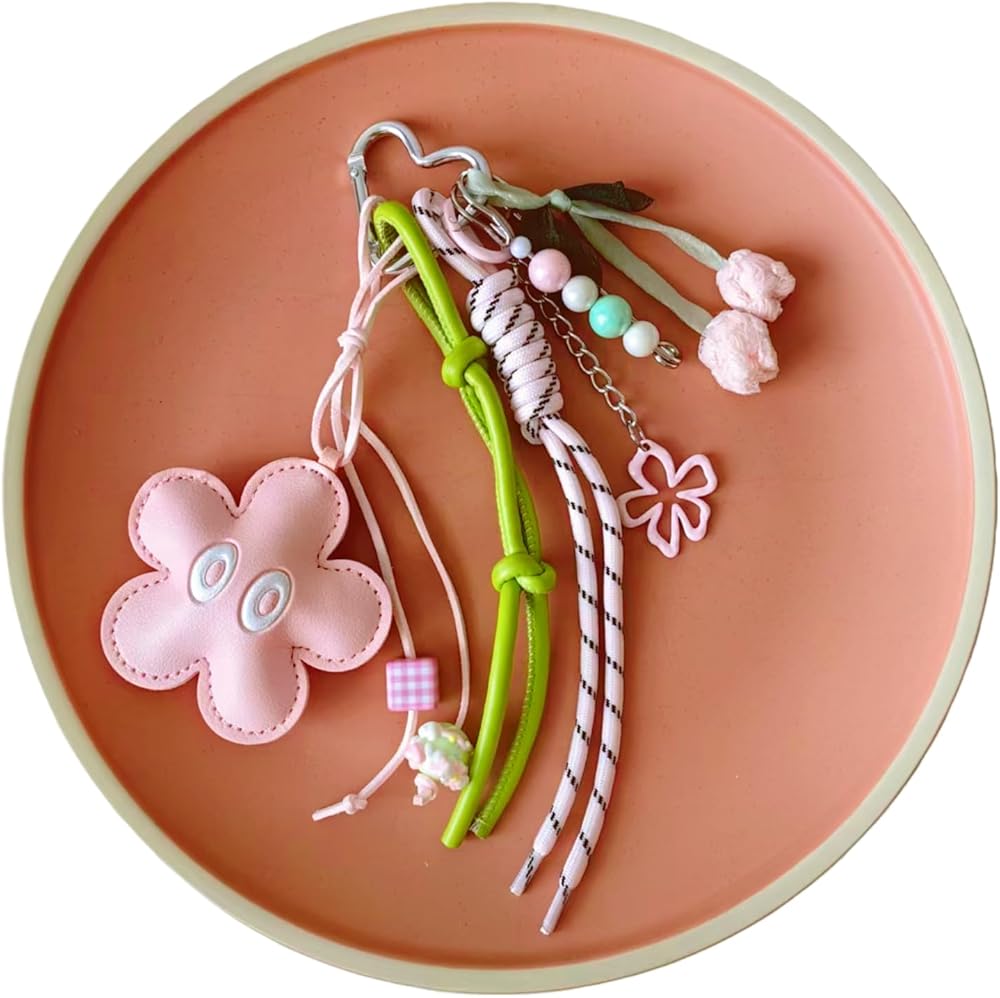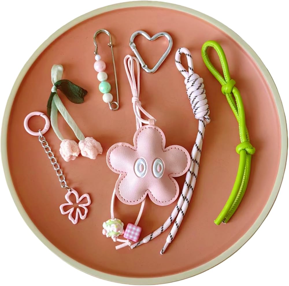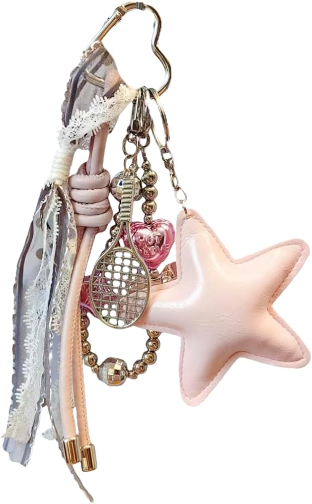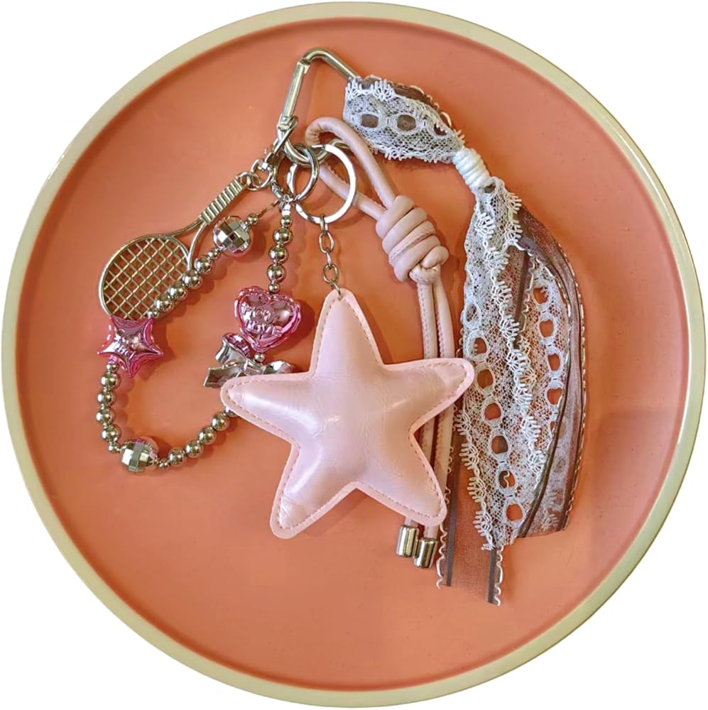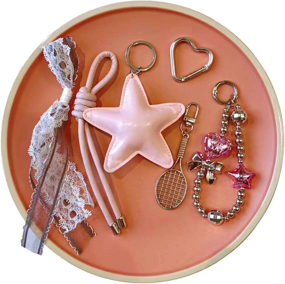 مجموعة سلسلة مفاتيح النجوم الوردي الجلدي - 7 قطع بالون بالون كيس سحر القلب حزام وردي وحبل مع Than