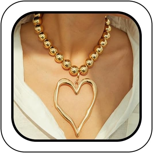 Y2K Statement Neck Jewelry: This chunky gold heart beads necklace screams fun with its oversized hollow love pendant and geometric round balls - the throwback to those trendy vintage Y2K vibes for parties or everyday drama
