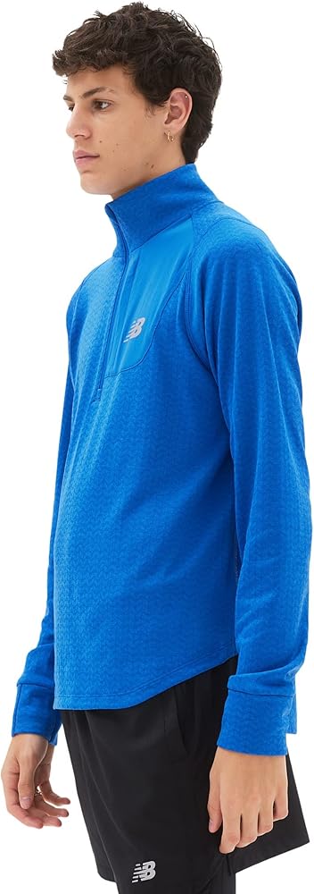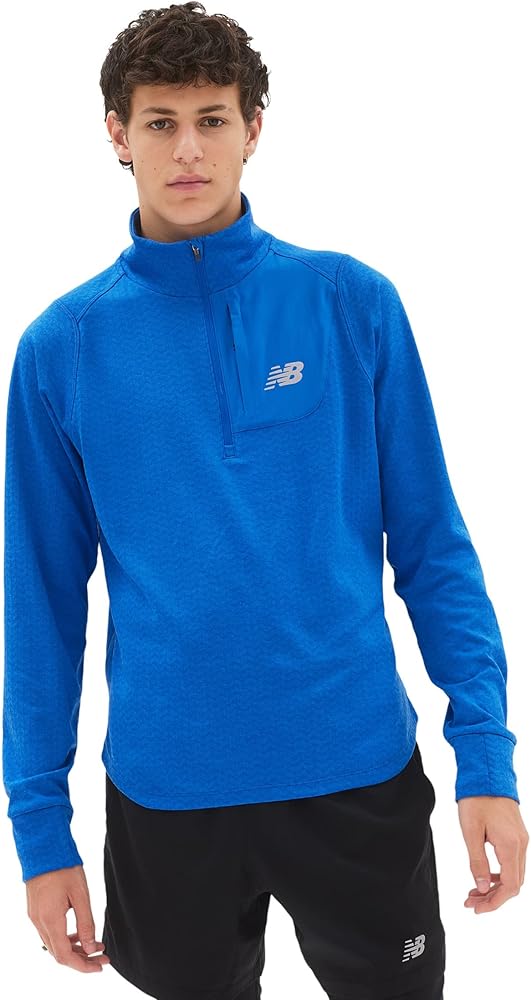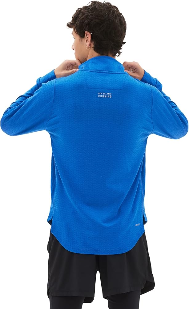 ابق دافئًا أثناء الجري في الطقس البارد مع السحاب النصف الشبكي الحراري نيو بلانس NB الذي يتميز بتقنية NB HEAT الماصة للرطوبة والتدفئة لمساعدتك على التركيز على أدائك وليس الظروف. يتميز هذا القميص الرجالي ذو الأكمام الطويلة بنسيج صوفي مزخرف لمزيد من الأناقة، وجيب منسوج على الصدر للتخزين الأساسي، وحلقات للإبهام لضمان ملاءمة محكمة ومريحة.