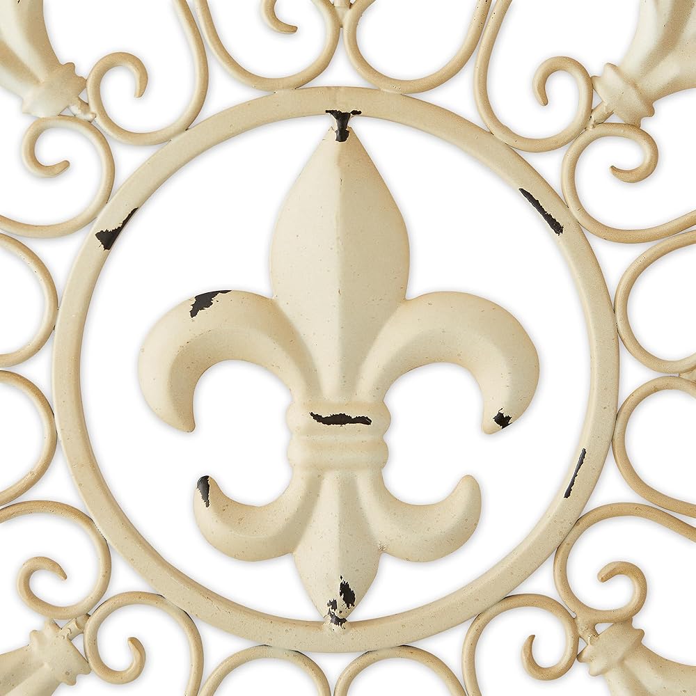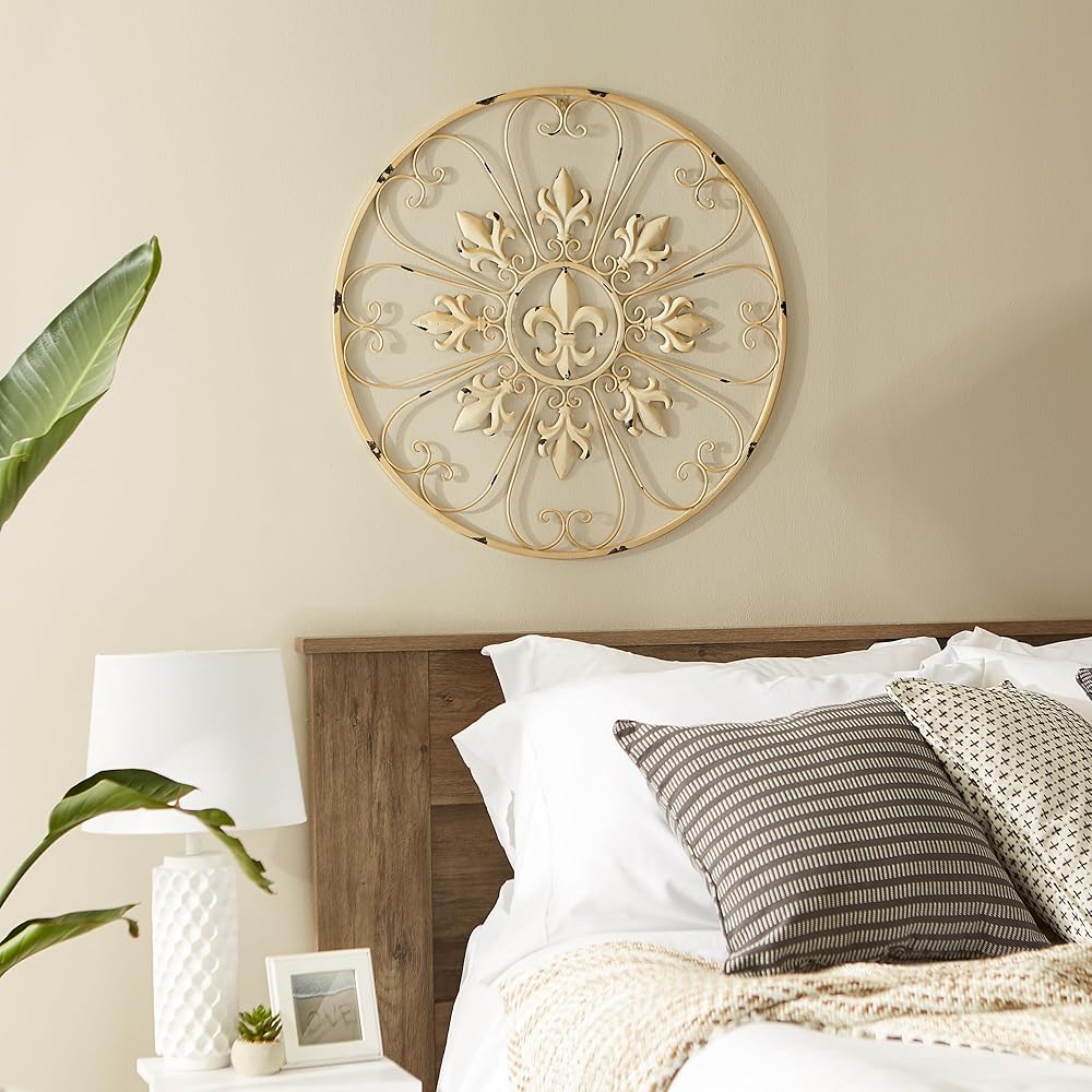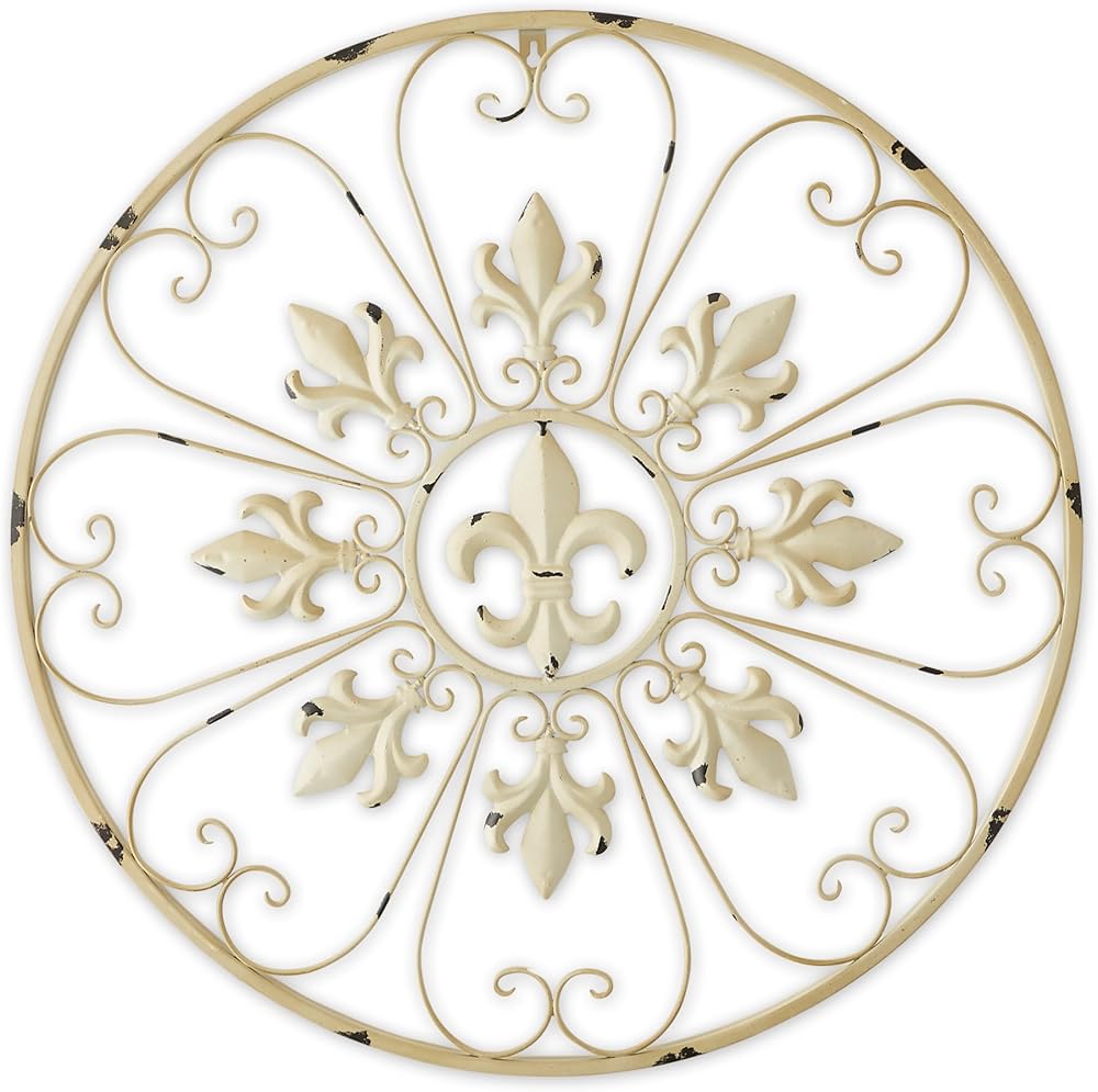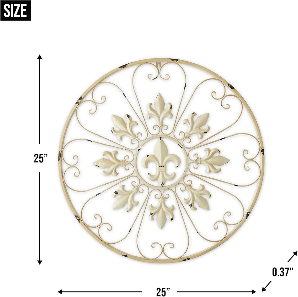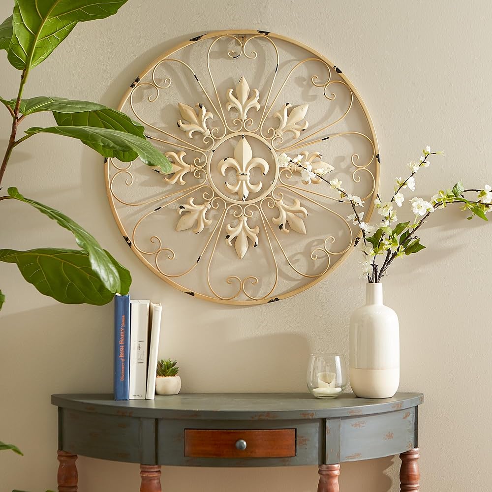 This cool wall accent measures more than two feet in circumference, and will have a big impact on the style of your room. It features French inspired fleur- de-lis symbols and heart-shaped scrolls that will bring an abundance of style to your bare wall.