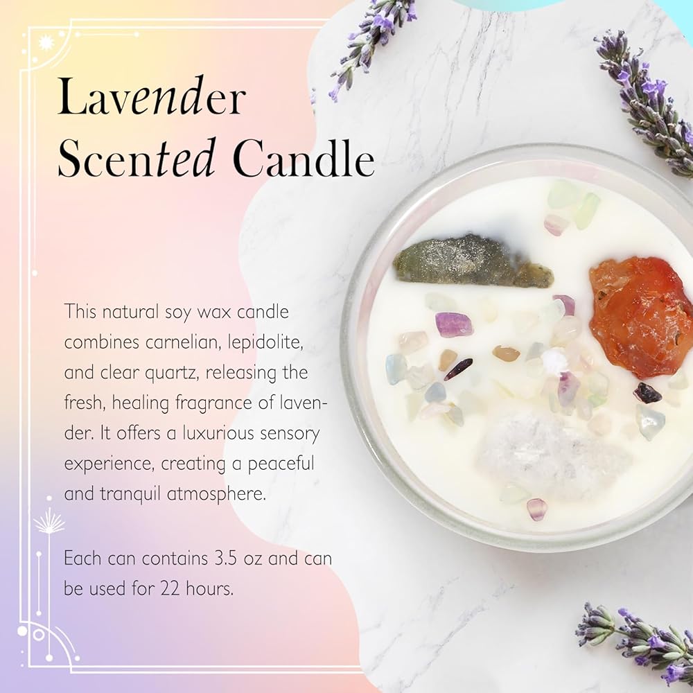 Lavender Scented Candle: Made with 100% soy wax and a lead-free cotton wick, this crystal candle is infused with the calming scent of lavender from Provence, France. It lasts up to 38 hours, filling your space with a fresh, soothing floral aroma. Infused with sunstone, red agate, or white crystal, this candle radiates the fierce and dynamic energy of Fire Signs, igniting confidence and adding a radiant spark to your self-care rituals.
