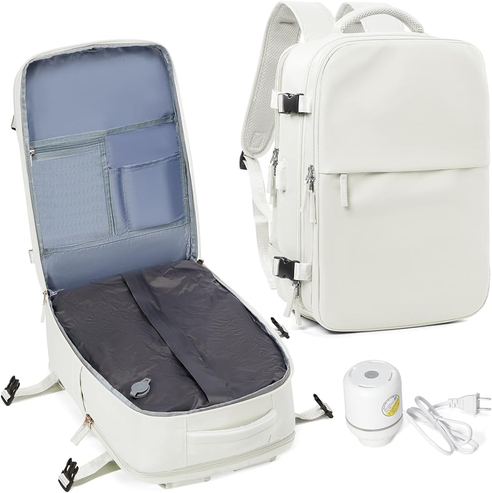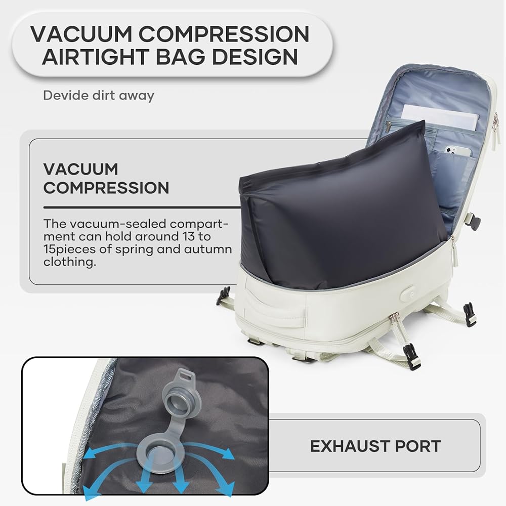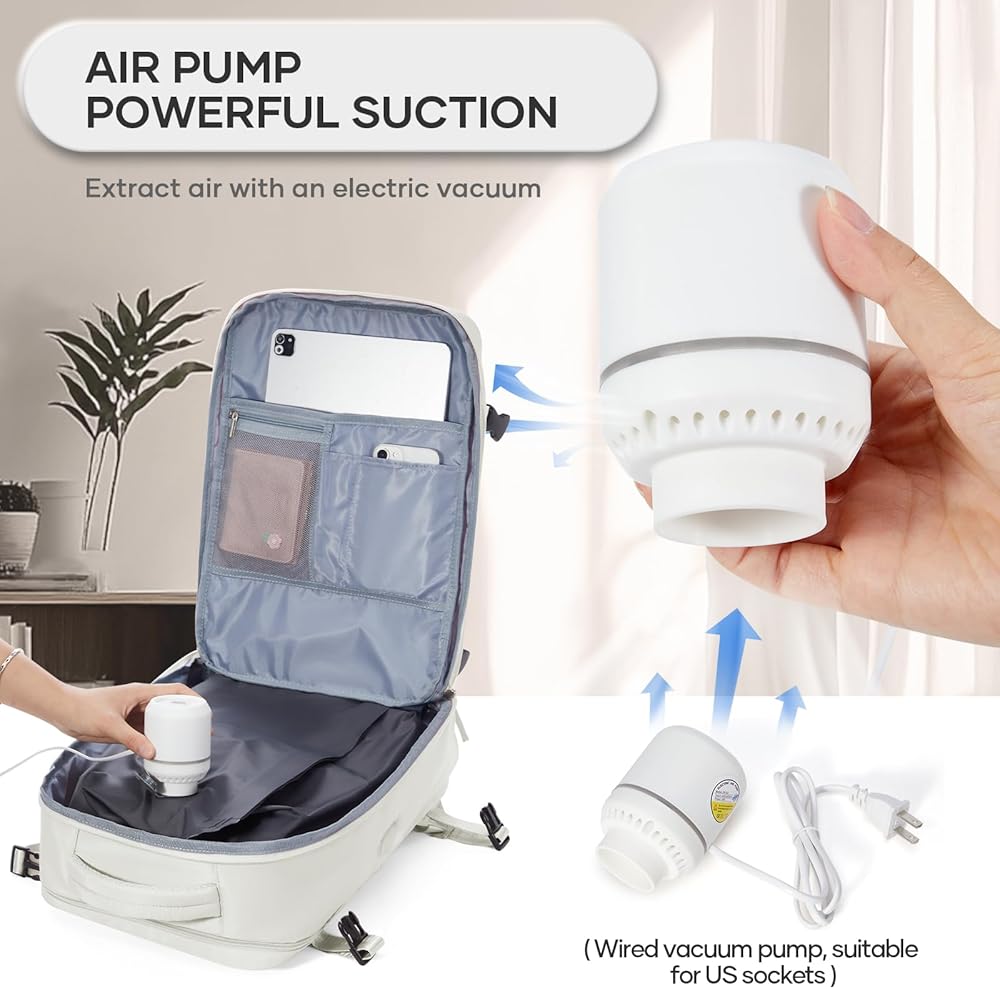 Durable Design: This travel backpack with vacuum system is made of thickened polyester fiber that can be reused for many years and can withstand rainwater. The sturdy metal double zipper and upgraded reinforced stitching extend its lifespan. Honeycomb back cushion design enables excellent air circulation and keeps the back cool and dry. Adjustable padded shoulder straps and shock absorbing foam ensure all day comfort even on long trips.