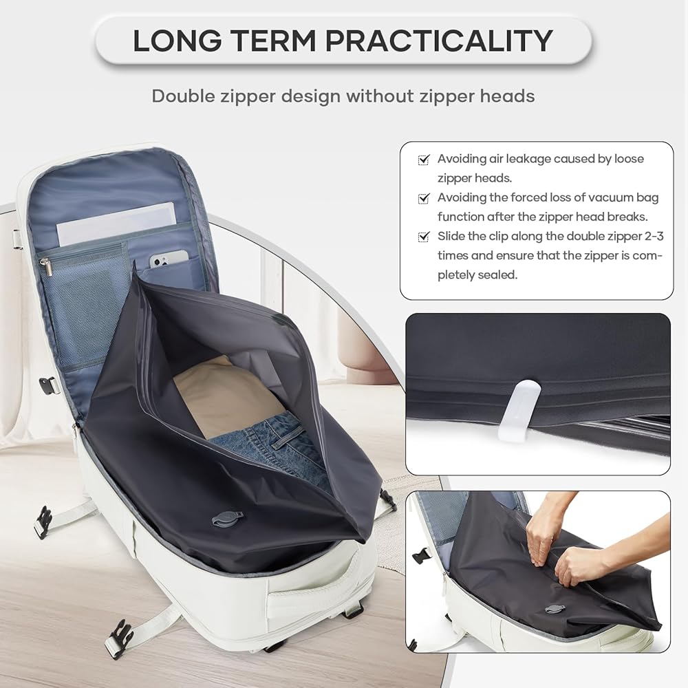 Long Term Practicality: The most unique feature of the vacuum bag equipped inside this travel backpack is that we use a double zipper design without zipper heads, which not only avoids the possibility of air leakage caused by loose zipper heads, but also avoids the possibility of the vacuum bag being forced to be invalidated after the zipper heads break. You just need to use the zipper clip and slide it back and forth a few times to ensure that the zipper is fully closed.