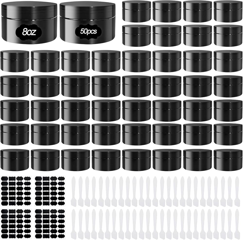 الحزمة الكاملة: تشمل هذه المجموعة 25 من الجرار البلاستيكي السوداء مع الأغطية ، صفحتين من الملصقات ، و 25 ملاعق قناع الوجه. تضمن الكمية الوفيرة أن يكون لديك ما يكفي للاستخدام الشخصي أو البدائل أو المشاركة ، ويجعلها مثالية لمختلف التطبيقات.