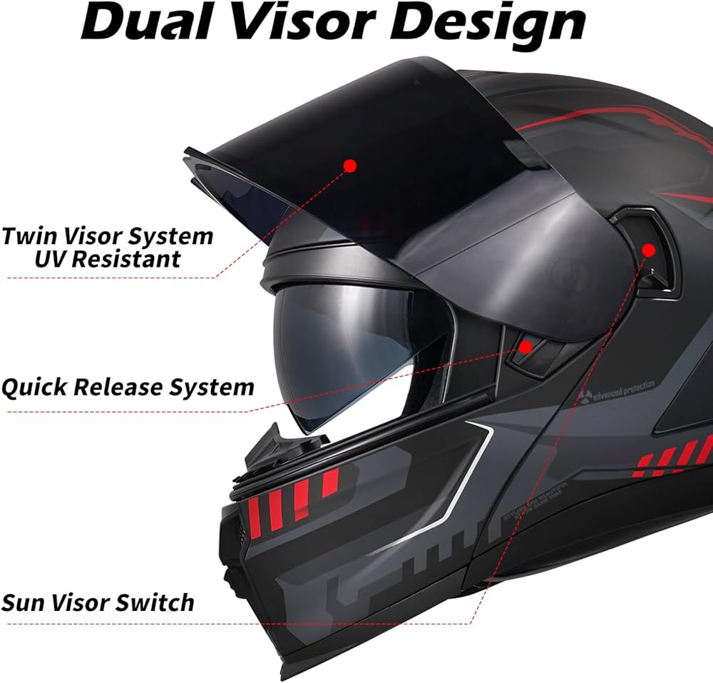 Packing Included:1pc Flip up Modular full face helmet with transparent visor and 1pc black visor