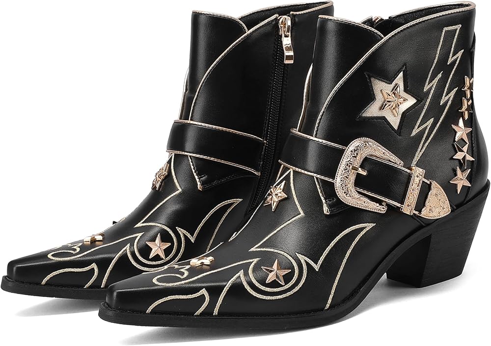 تصميم أنيق مستوحى من الأنيقة-يضم هذه الزينة المعدنية المرصعة بالنجوم والخياطة الغربية المعقدة ، تمزج هذه الأحذية جماليات رعاة البقر الرجع