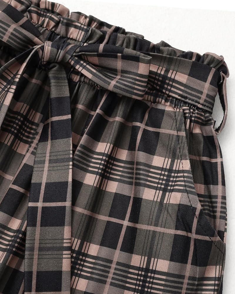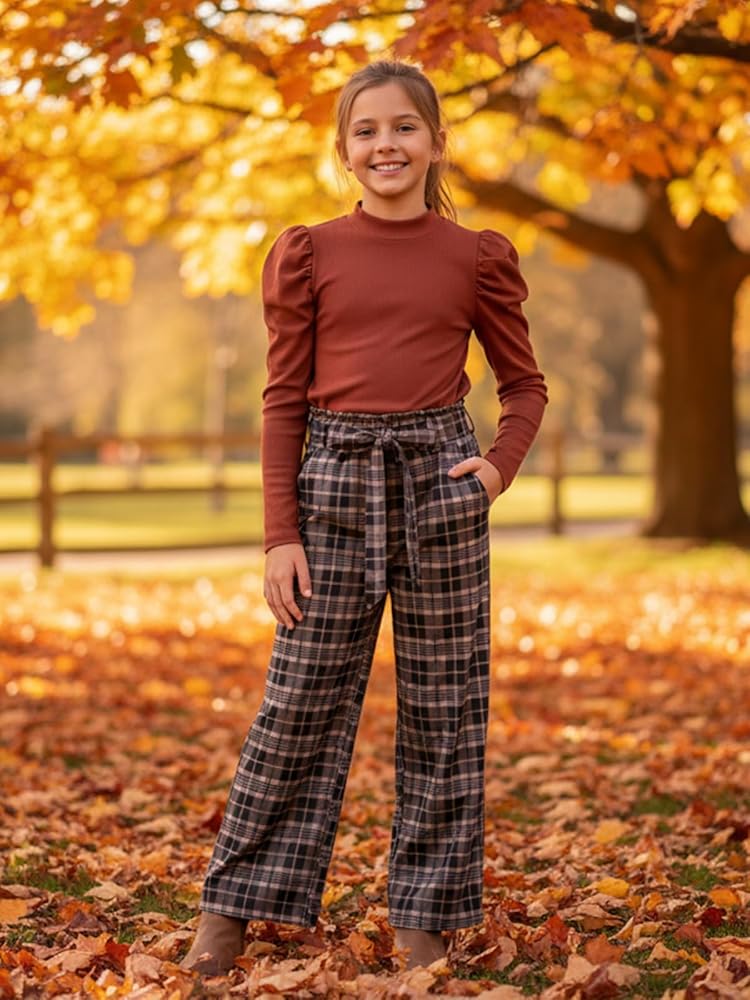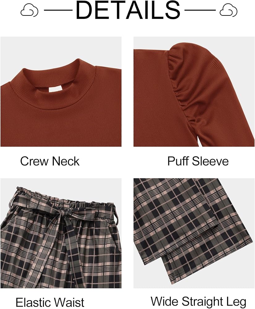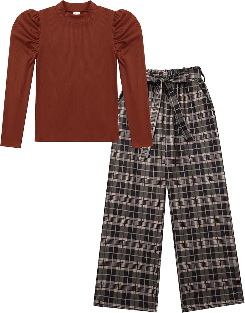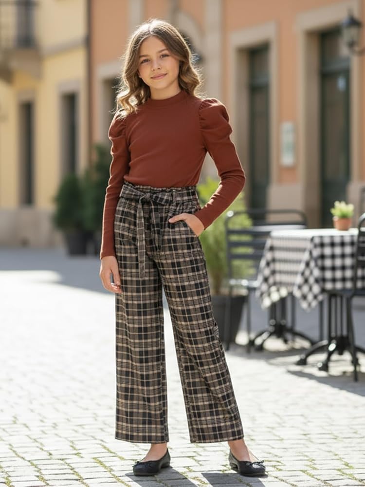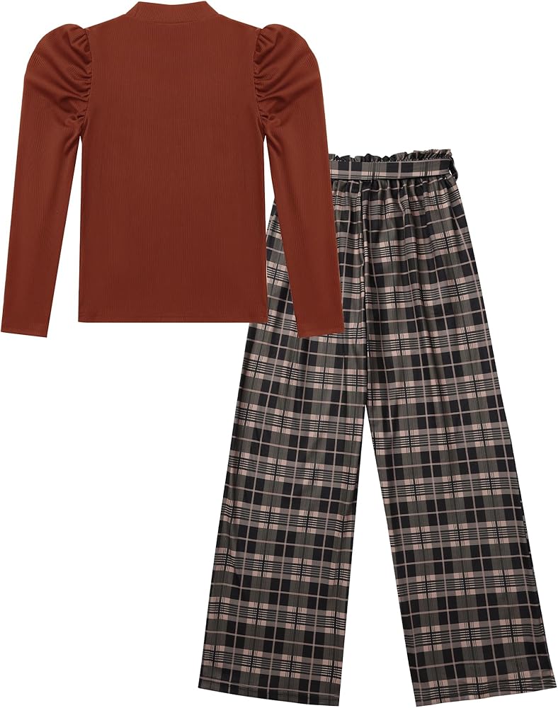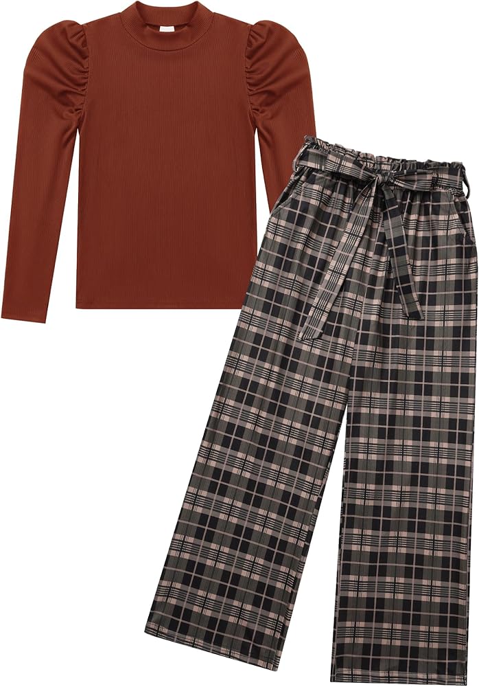 التصميم الكلاسيكي: تتميز هذه الفتيات بقطعة من قطعتين بلوزة مضلعة أنيقة من الرقبة بأكمام نفخة رائعة ، مقترنة بنطال منقوش على عريض. تشمل سروال الفحص حزام مرن وحزام التعادل القابل للتعديل لتناسب كل فتاة آمنة.