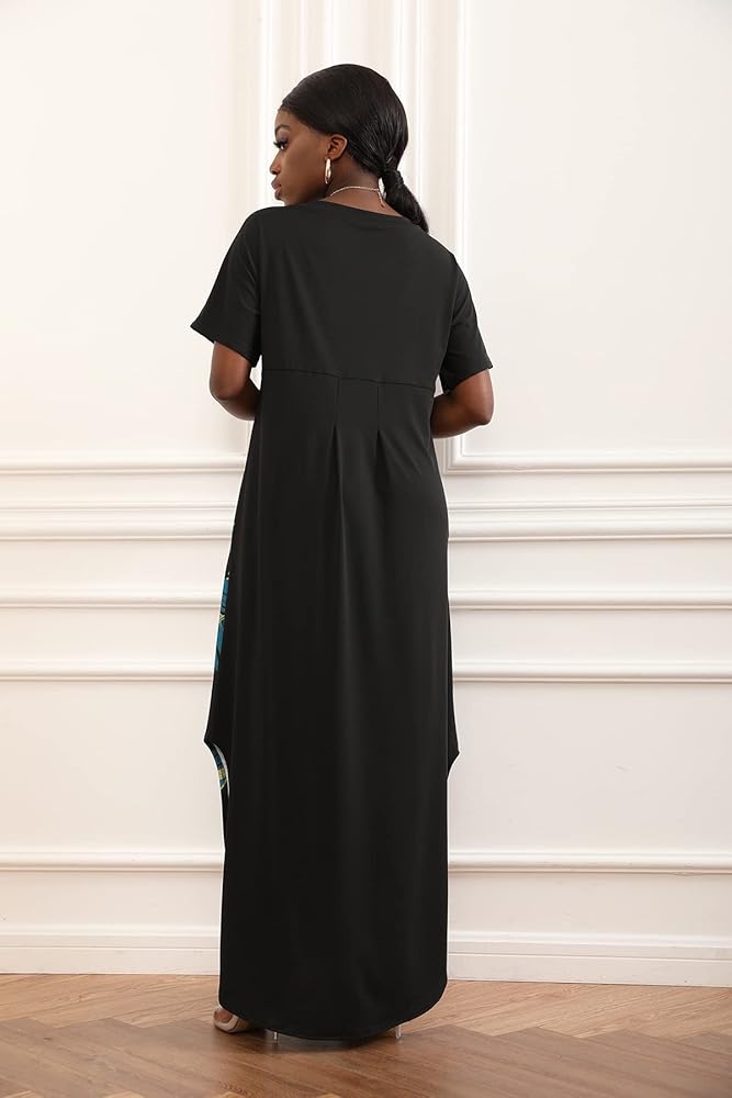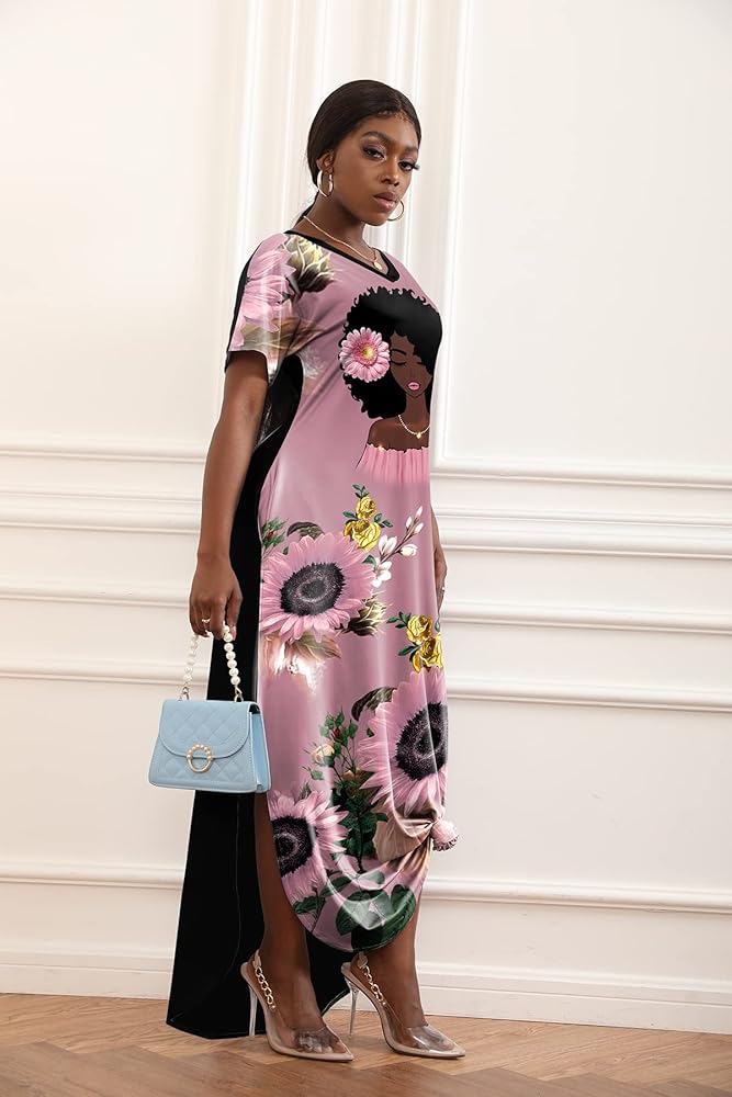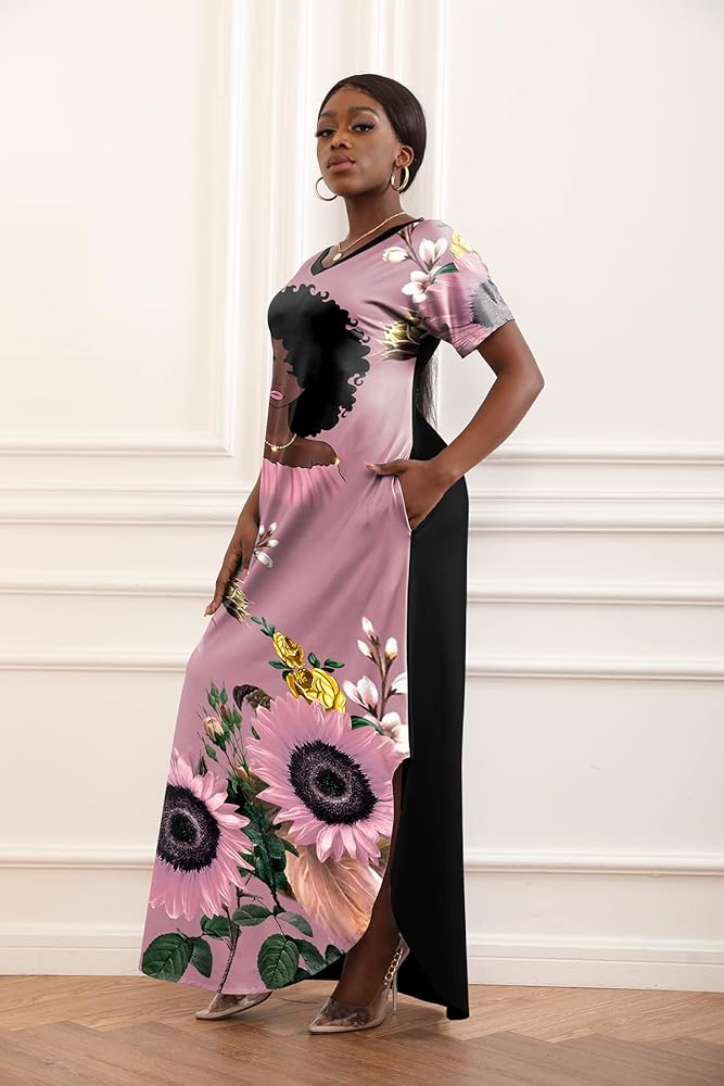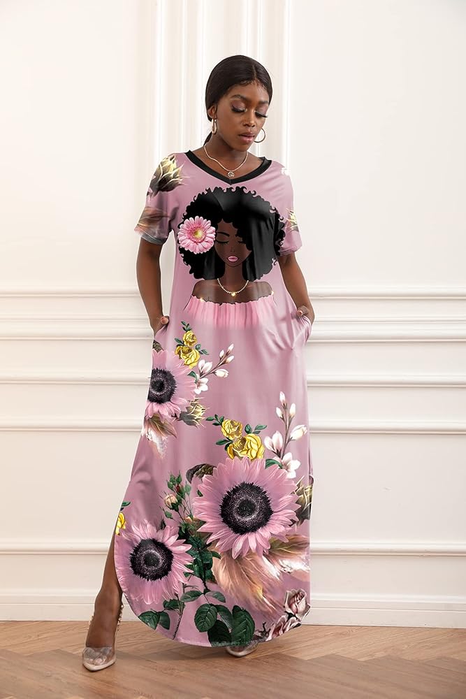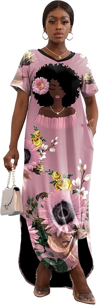 المزايا: رقبة دائرية، أكمام قصيرة، رقبة على شكل حرف V، طباعة زهور، فتاة ميلانين، ملكة سوداء، إلهة سوداء، سحر أسود، جيبان، مقاس فضفاض، مقاس إضافي، طول الأرض، غير مبطن، فساتين طويلة، نمط كاجوال، ميلانين عصري فريد النمط يجعلك جميلة للغاية، وسوف تحصل على العديد من الإطراء في كل مناسبة.