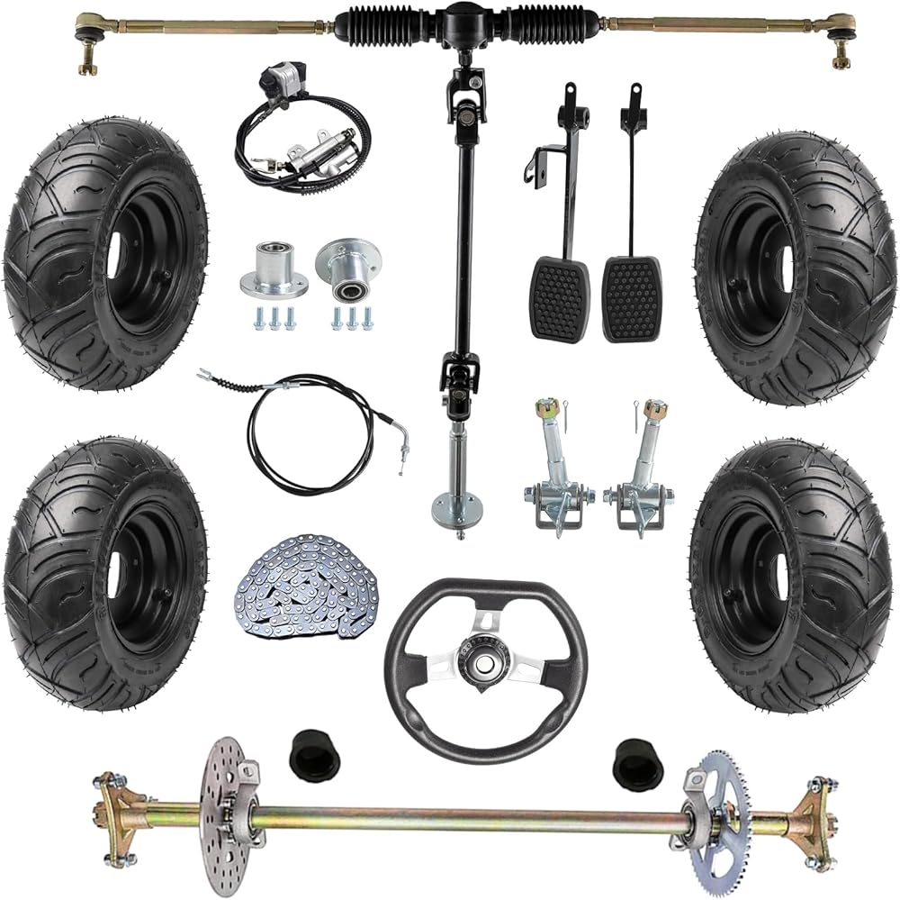 • Complete Package Includes: Axle Assembly, (4) Wheels (with tire, rim, tube), T8F Chain, Brake Master Cylinder Caliper Assembly, Sprocket, Brake Disc, (2) Pillow Block, (2) Front Wheel Hubs, (1) Left & Right Steering Knuckle ,(1)Steering wheel , Full set of steering gear rack shaft assembly , Pair of brake and throttle pedals, (1) throttle cable