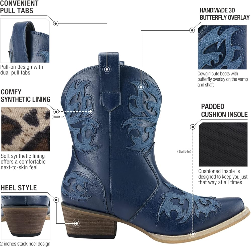 تصميم خالد وسهل الارتداء: أحذية رعاة البقر الغربية اللطيفة هذه مصنوعة من طبقة خارجية على شكل فراشة على مقدمة الحذاء والعمود. مثالي لجميع المواسم التي تبدو رائعة مع الجينز والسراويل القصيرة والفساتين وكل شيء يخطر ببالك. يبلغ قياس الكعب حوالي 2 بوصة.