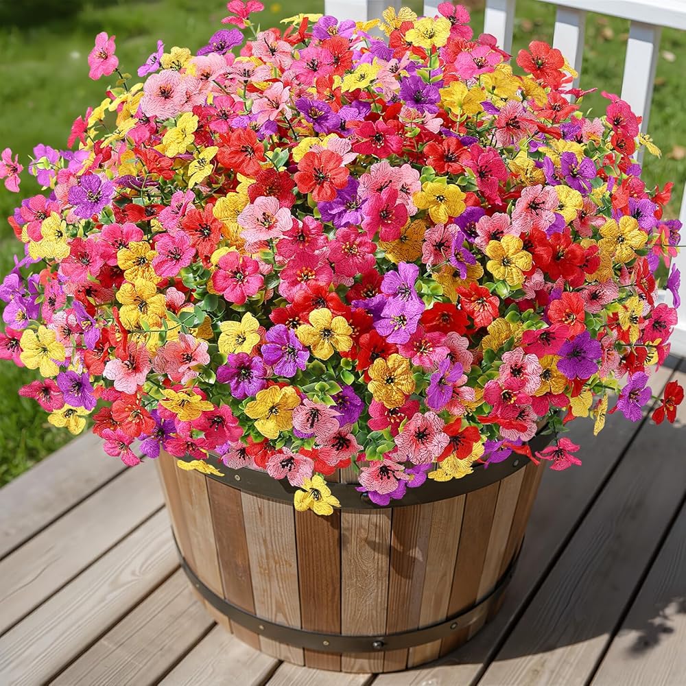 🌸【Perfect for Outdoor/Indoor】Plastic flowers are ideal for outdoor porches, walkway, terraces window box, front yard, pots ,hanging planters, gardens, landscape, windowsills, allow you have beautiful color all year around. Also suit for birthdays, weddings, memorial place or grave, they can live anywhere and have withstood heavy rain storms and winds.