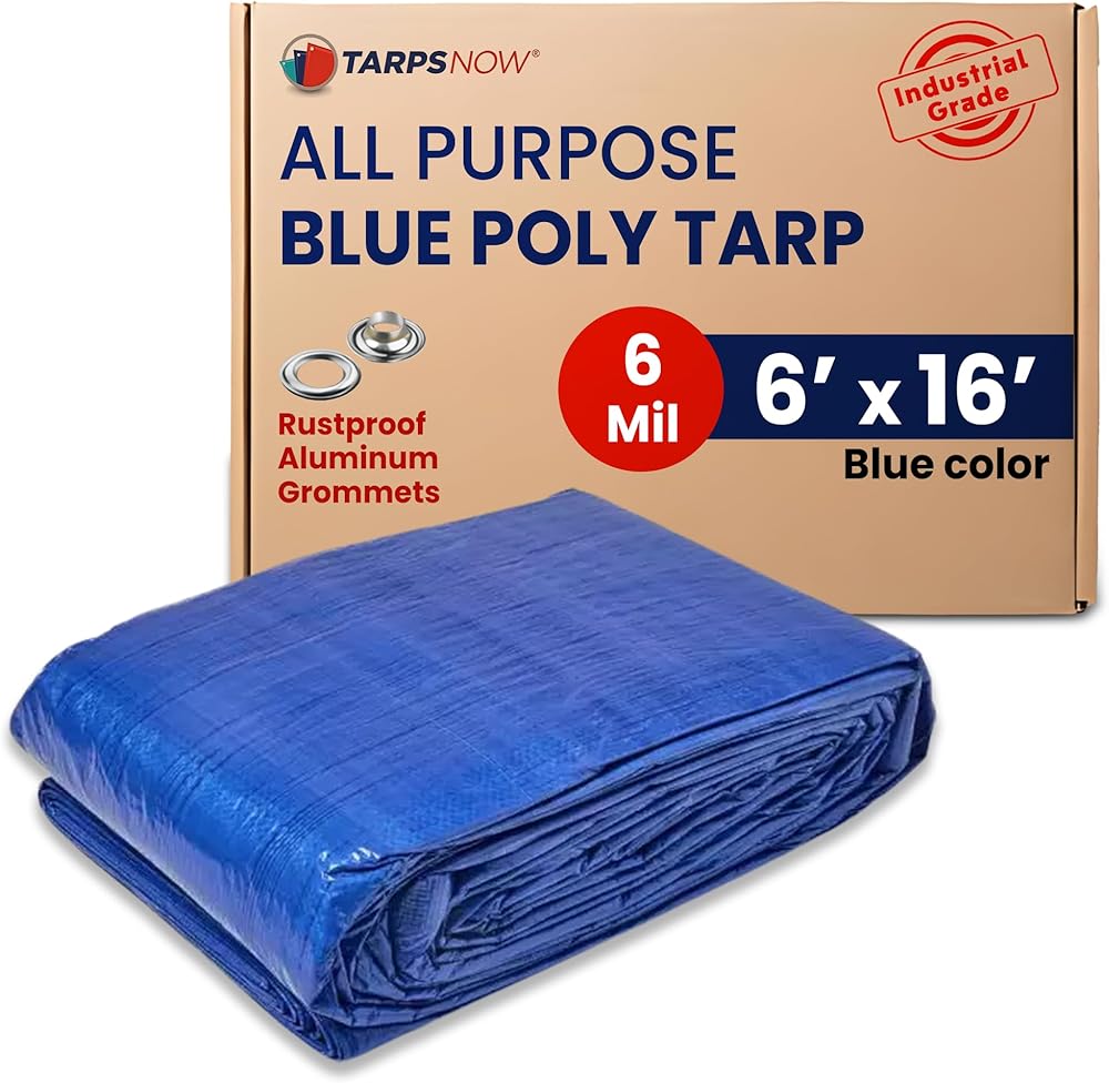 Tarps Now Heavy Duty Plastic Tarps offer reliable waterproof protection for a wide range of indoor and outdoor applications. Built from 3-ply polyethylene with a solid coating on both sides, this blue poly tarp is engineered with heat-welded seams and reinforced corners for durability in tough conditions. The 6 mil thick design offers long-lasting protection from rain, snow, sun, and debris. Rope-hemmed edges and rustproof #2 aluminum grommets—spaced every 36 inches—make it easy to tie down this tarp securely over vehicles, equipment, structures, or landscaping. With a weight of 4.5 oz per square yard and a mesh count of 8x8, it balances strength and flexibility for repeated use. Ideal as a roofing tarp, construction site cover, RV or boat shield, ground tarp for camping, or general-purpose protective cover. This poly tarp is versatile enough for contractors, homeowners, and outdoor enthusiasts looking for dependable weather resistance and easy deployment.