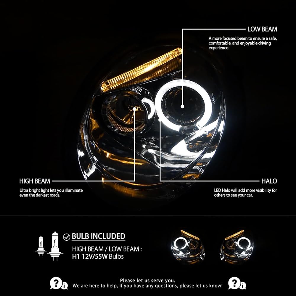 DETAILED INFO: Brand new in original packaging. Exactly the same as shown in the picture! Comes with both headlights. H1 light bulbs included for HIGH/LOW beam. High quality glossy black housing smoke lens projector headlights w/ halo rings. These lights are made by an OE approved and ISO certified manufacturer with the quality meet or exceed all OE standards. Doesnt come with installation instructions. Professional installation is recommended. VEHICLE COMPATIBILITY: Compatible with Volkswagen Beetle 1998-2005 models (Not compatible w/ factory Xenon headlight models and Turbo S models).
