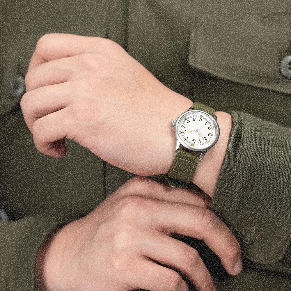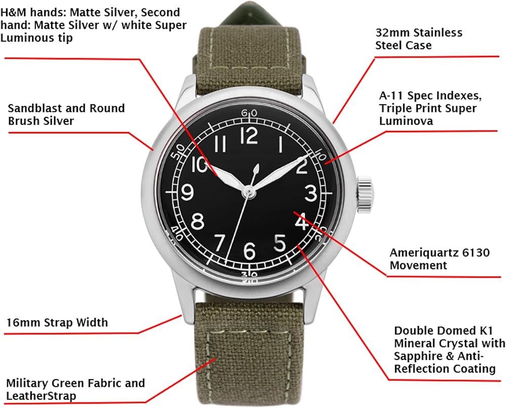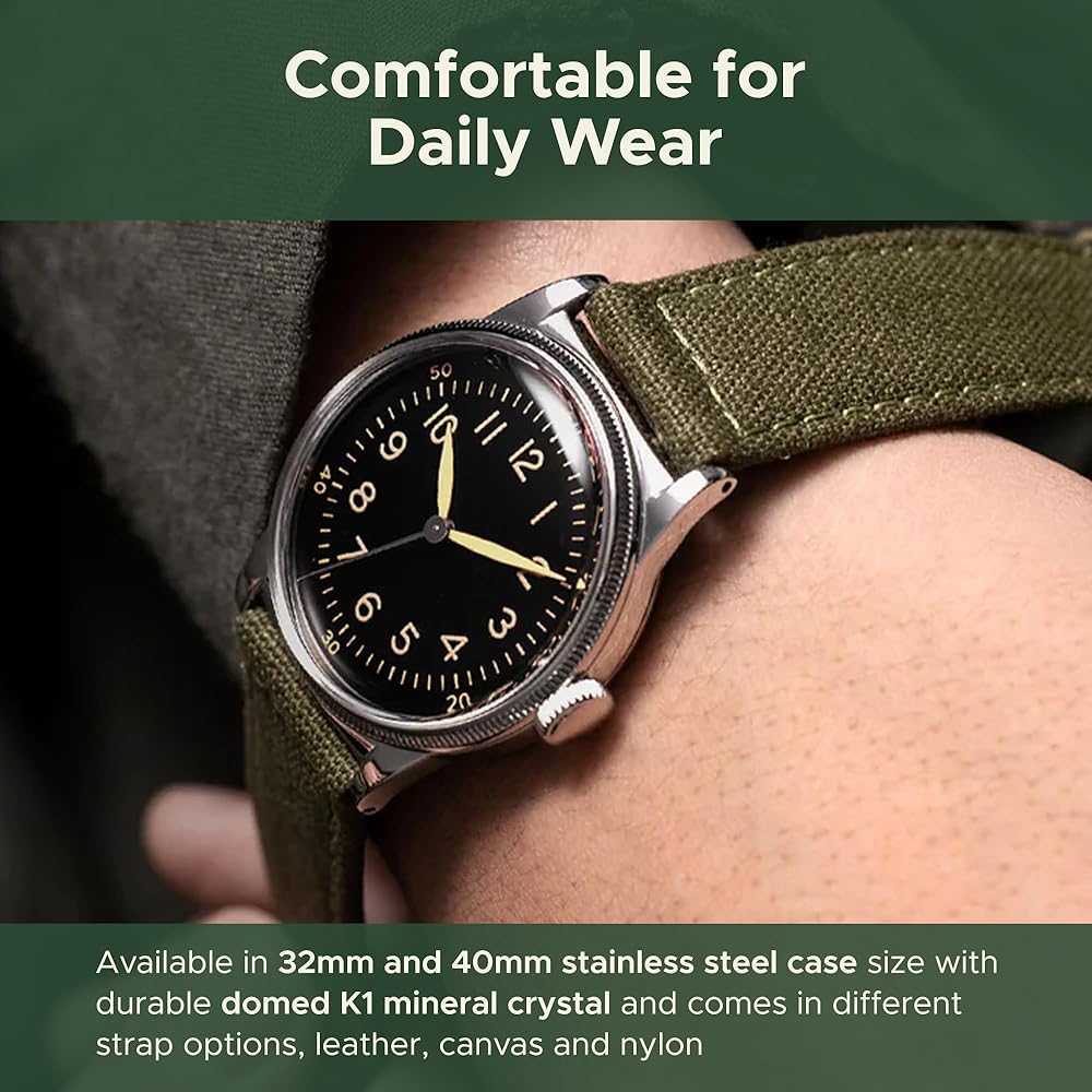 ساعة كلاسيكية مدعومة بالحركة الأمريكية: ساعة يد مقاس 32 مم / 40 مم مزودة بـ Ameriquartz 6130 الدقيق والمتين من FTS ومقرها أريزونا لتظل وفية لطرازات A-11s الأصلية في الأربعينيات من القرن الماضي.