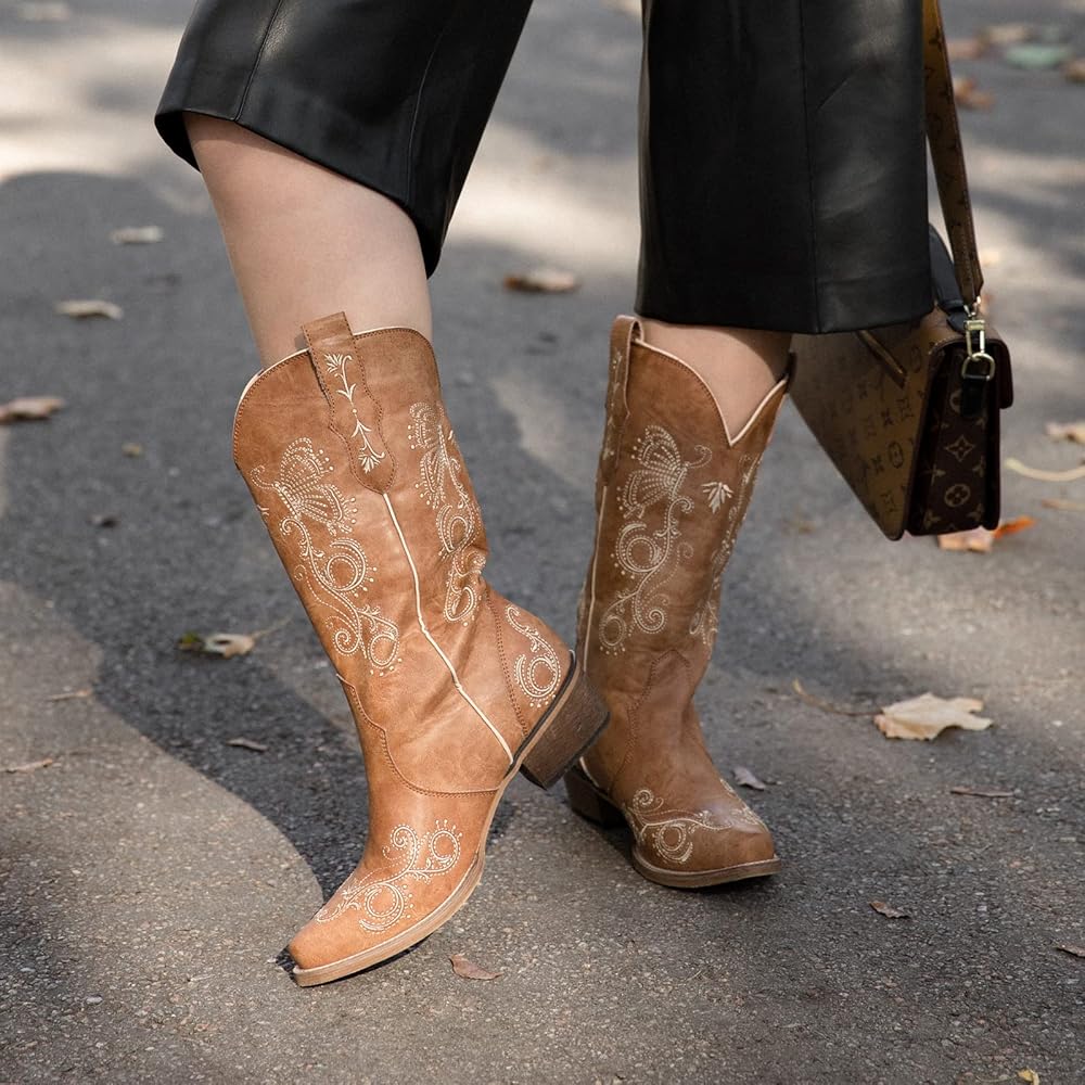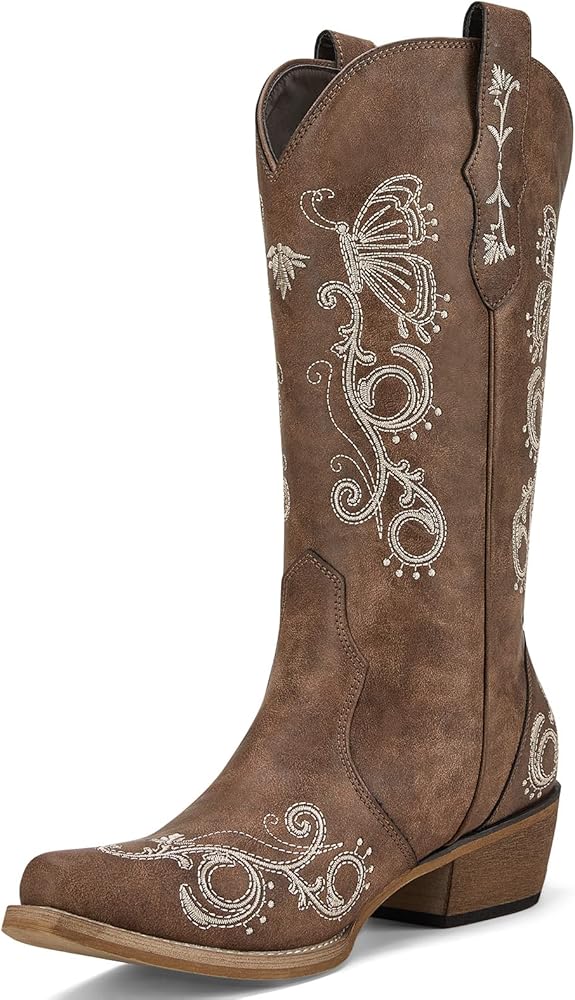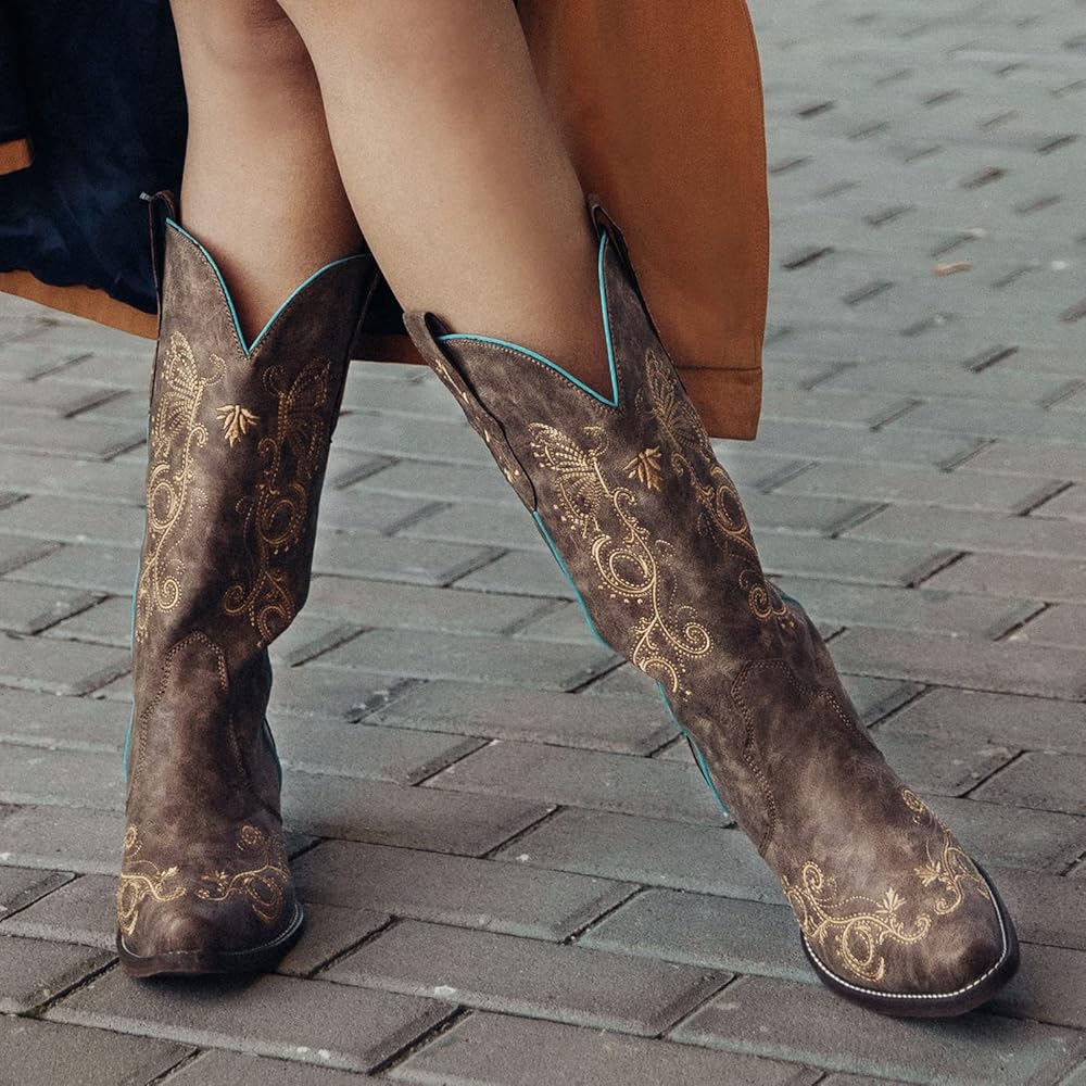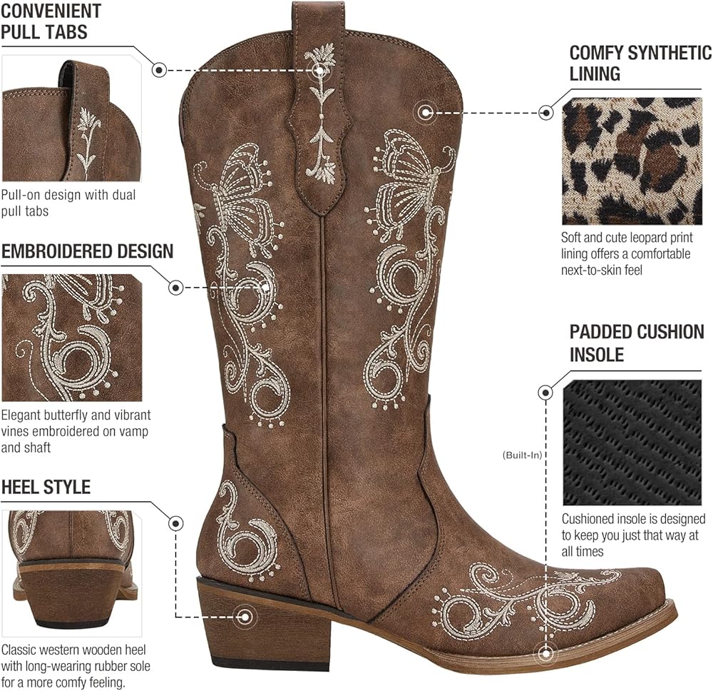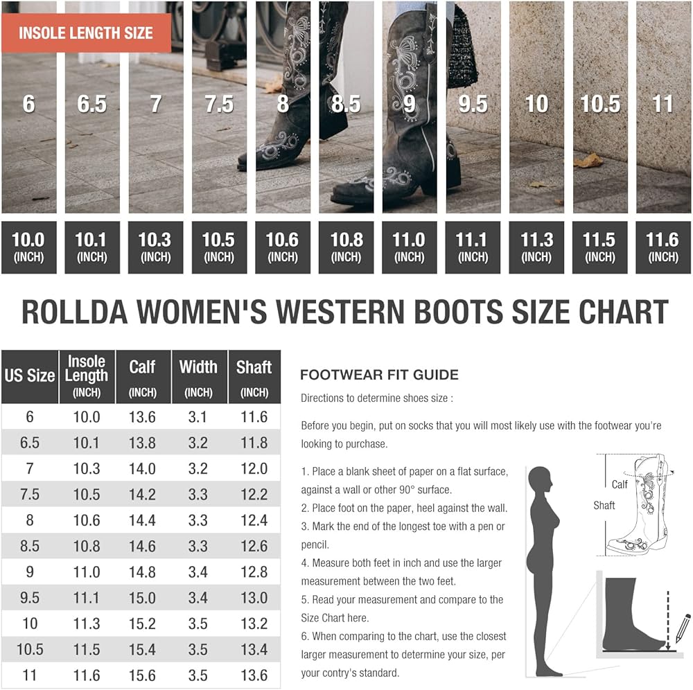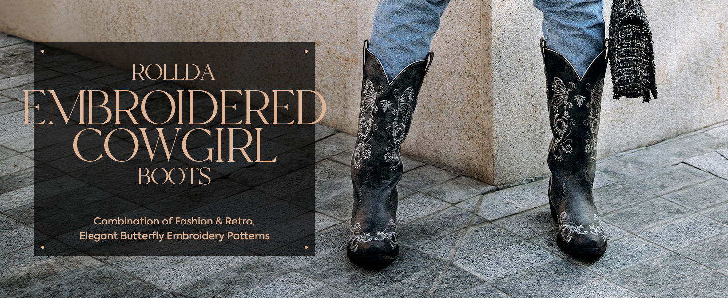 كلاسيكي ومتعدد الاستخدامات: يتميز بفراشة أنيقة وكرمة نابضة بالحياة مطرزة على مقدمة الحذاء وعموده مما يضيف المزيد من الشخصية إلى مظهرها. تم تصميم أحذية رعاة البقر هذه للنساء من رولدا بمهارة، وسهلة الارتداء ومثالية لجميع المناسبات والمواسم.