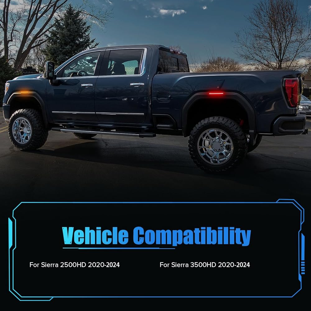 النماذج المطبقة: 4pcs LED LED Clear Lens Side Fender Marker Lights متوافقة مع 2020 2021 2022 2023 2024 2025 Sierra 2500HD 3500HD Light 2xfront (Amber) & 2xrear (Red) OEM#: 84806032 84185031
