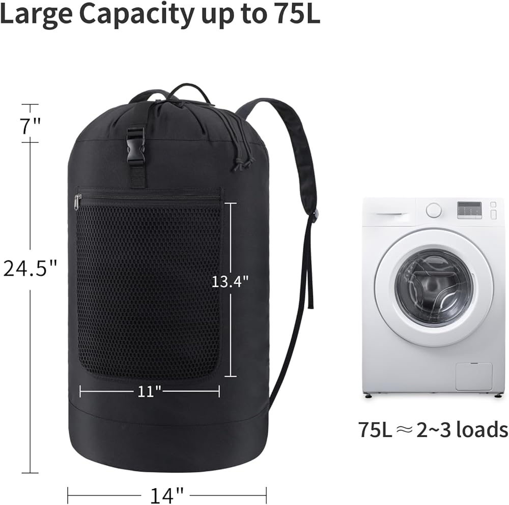 حقيبة غسيل مغسلة ، حقيبة تحمل على الظهر الثقيلة - حقيبة ظهر غسيل كبيرة السعة مع أحزمة راحة وجيب شبكي وجيب مضغوط ، حقيبة عائق قوية للمسكن ، الكلية ، السفر ، المغسلة ، الشقة ، 75 لتر أسود