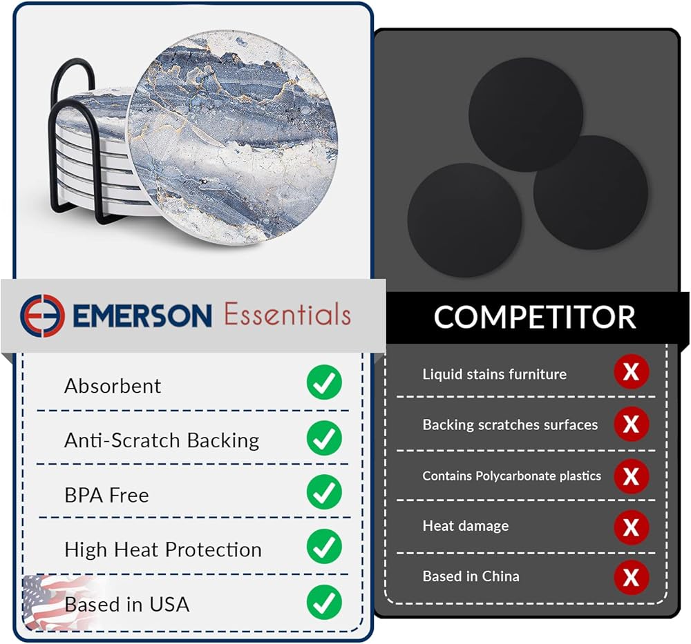 • ضمان لمدة 12 شهرًا وضمان الرضا بنسبة 100%: يقع مقر Emerson Essentials بفخر في الولايات المتحدة الأمريكية، وتأتي قواعد الأكواب الخاصة بك تلقائيًا مع ضمان لمدة 12 شهرًا بالإضافة إلى سياسة ضمان الرضا بنسبة 100%! منتجاتنا مصنوعة لتتحمل سنوات من الاستخدام، وإذا لم تحبها لأي سبب من الأسباب، فسنعيد لك أموالك بالكامل دون طرح أي أسئلة.