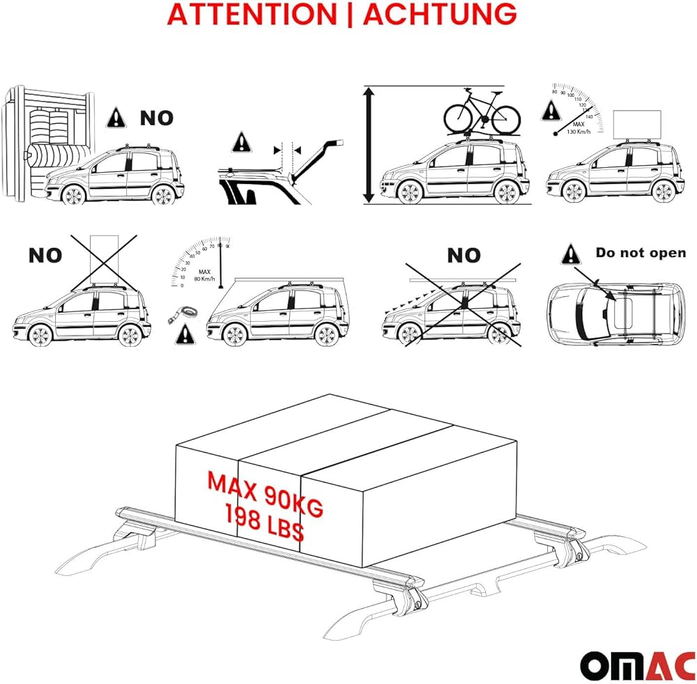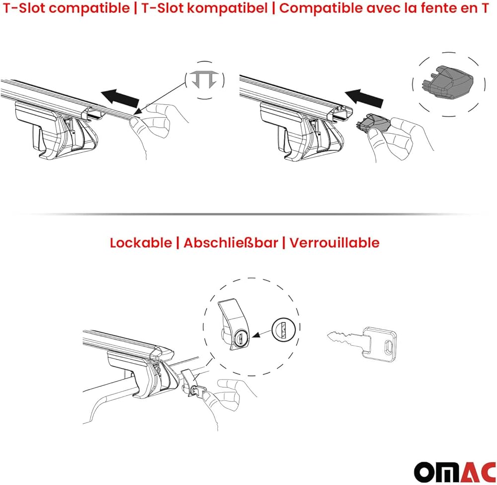 OMAC high-quality aluminum roof racks with European design & style. Its aerodynamic design, anti-theft lock, and easy installation make it a perfect fit for your vehicle. This removable and lightweight rack is ultra durable, waterproof, and wind resistant. With T-tracks and low noise, it accommodates bike and ski carriers. It's also compatible with roof cargo boxes, luggage, and kayak carriers. Experience the versatility of our multifunctional cross bars for all your travel needs.