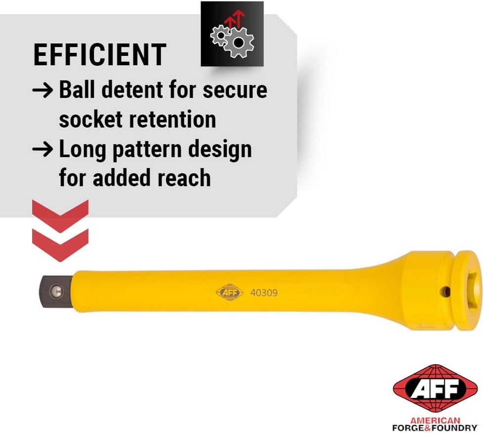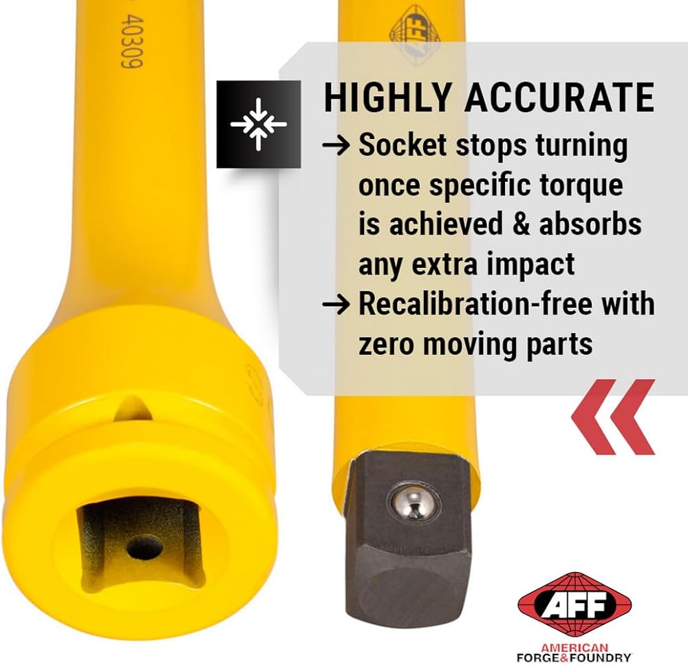 American Forge & Foundry Torque Limiting Extension, 3/4" Drive, 250 ft/lbs., Yellow. Socket prevents overtightening or uneven tightening of lug nuts. Limited Socket reduces risk of wheel and brake rotor damage; socket stops turning once specified torque is achieved and absorbs any extra impact. Constructed with durable chrome molybdenum spring steel; Powder coated finish provides scratch and corrosion resistance. Size and torque rating are roll stamped on the drive end for easy identification. Established in 1963, American Forge and Foundry (American Forge & Foundry) has provided value through our selection of highest-quality, "forge tough" heavy-duty and automotive service equipment. From our extensive inventory of parts to the hundreds of service depots available nationwide our experienced team is committed to ensuring that the American Forge & Foundry brand stands for durability, safety, and customer care.