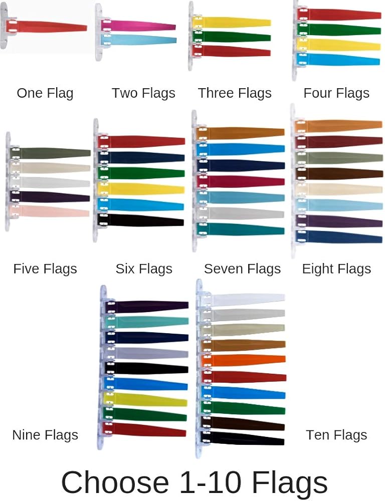 Flags measure 7.125 inches x 1.25 inches and are constructed of durable molded plastic resistant to chemicals, bending, and scratching. Select "Customize Now" to choose from 22 highly visible color options. When wall-mounted, flags can be opened to either 45° or 90° angles for greater flexibility.