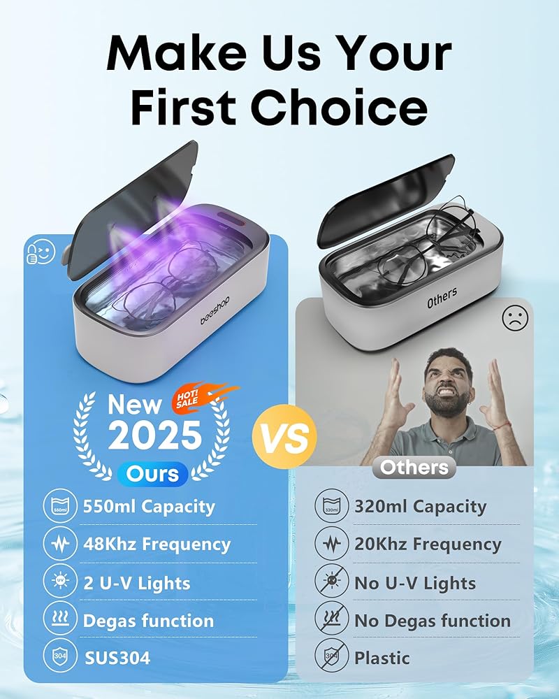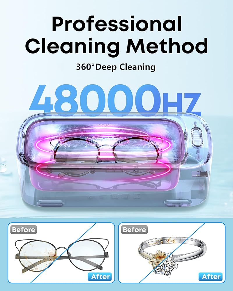 【48 كيلو هرتز بالموجات فوق الصوتية و 2 مصابيح LED تنظيف قوي】 آلة نظافة المجوهرات هذه تجمع بين 48 كيلو هرتز بالموجات فوق الصوتية عالية التردد وتكنولوجيا الضوء الخاصة ، وتوفير نظيفة عميقة 360 درجة ، استعادة اللمعان على العناصر الخاصة بك. مع 2 مصابيح ، قم بإزالة الأوساخ غير المرئية بشكل أكثر فعالية من الأسطح! (يرجى ملاحظة: لا تغسل النظارات باستخدام طلاء U-V والمجوهرات الهشة ، مثل اللؤلؤ ، الأوبال ، البريل ، الفيروز ، المرجان.