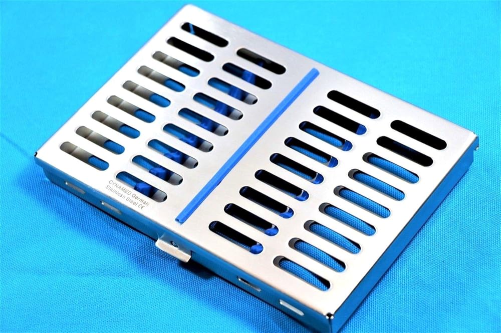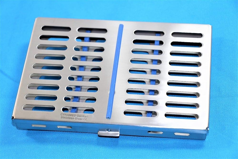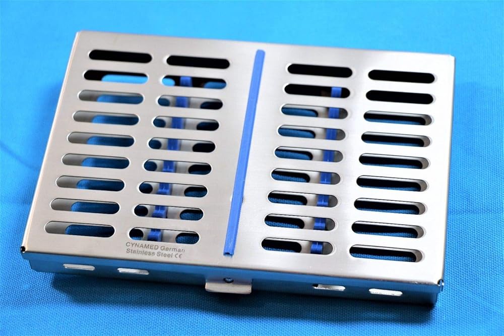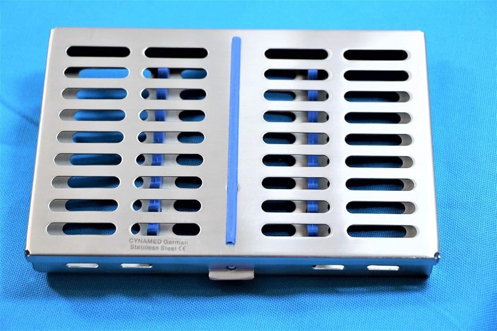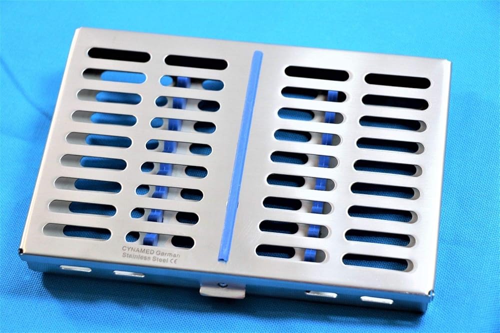 EXCELLENT QUALITY GERMAN STEEL NEW Dental Sterilization Cassette Rack Tray Box for 10 Dental Surgical Instruments Retail Value >399 USD! ASTM STANDARD 304 TYPE STAINLESS BRAND CYNAMED USA High quality Medical Standard German Steel and Medical Grade Silicone Racks. The silicone racks can be taken out for cleaning. Autoclavebale and Sterilizable. Holds 10 Instruments. Detachable and lockable design, easy to clean Dimension: 7.25" L X 5"W X 0.75" H