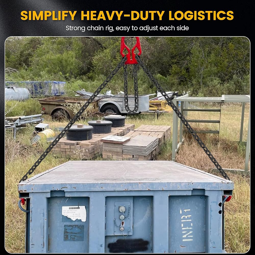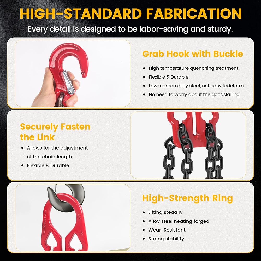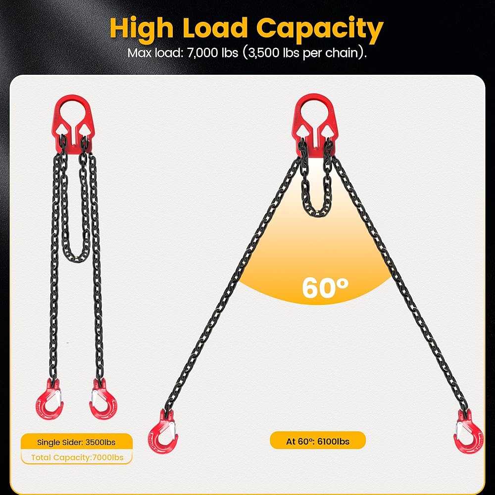 السعة العمودية 7000 رطل-: سلاسل الصلب من الدرجة 80 من الدرجة 80 مع مقبض تصميم مزدوج السقوط مقبض مصاعد مستقيمة 7000 رطل (6100 رطل @ 60 ° زاوية الاختيار) ، تتجاوز معايير ANSI B30.9. مثالي لرفع المحرك ، نقل الصحافة الهيدروليكية ، وعمليات تحميل البليت