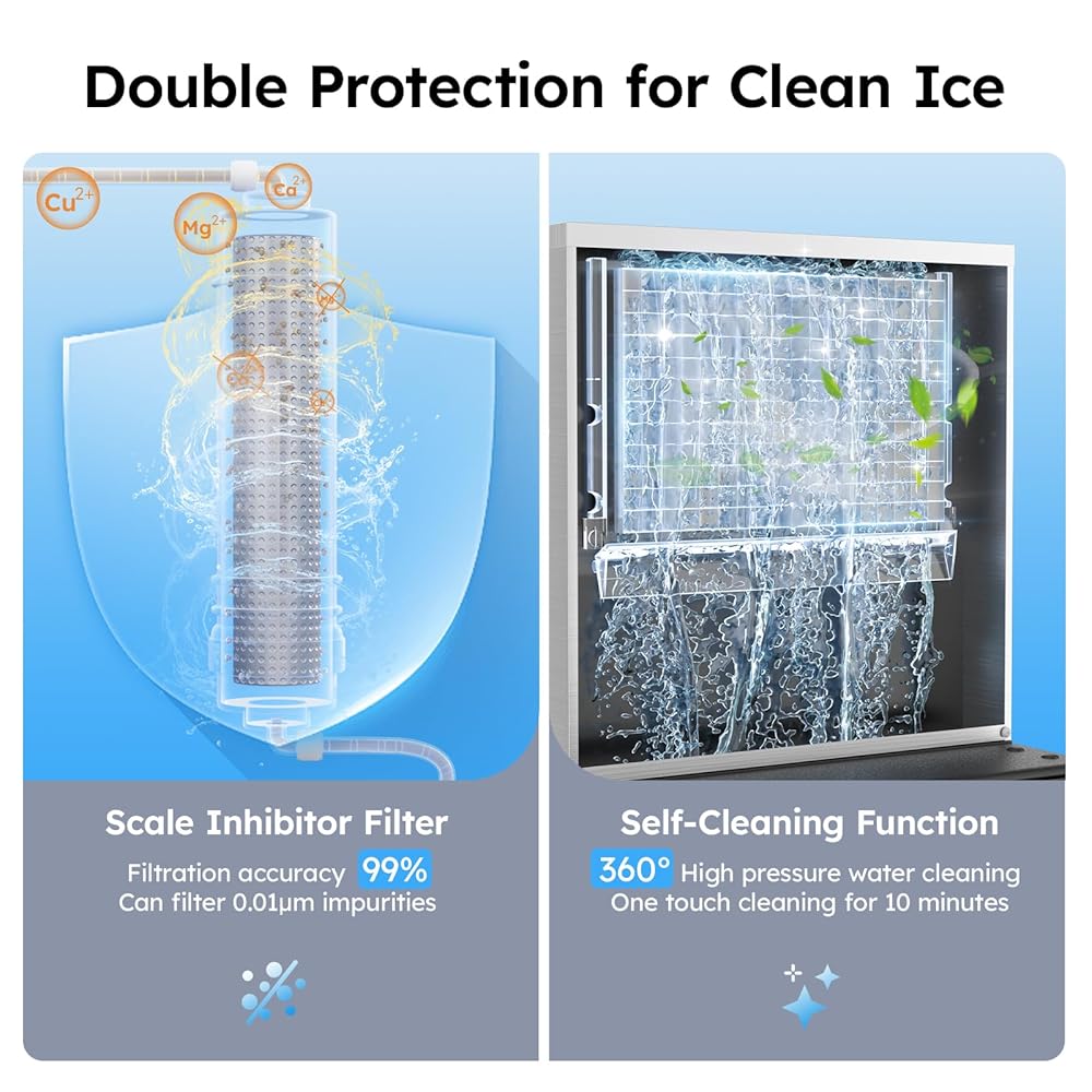مرشحات التنظيف الذاتي و 0.01μm مرشحات: يأتي صانع الجليد مع وضع التنظيف الذاتي ، والذي يتيح لك تنظيف صانع الجليد بسهولة. يمكن للمرشح 0.01μm عزل معظم الشوائب والحصول على جليد آمن ونقي.